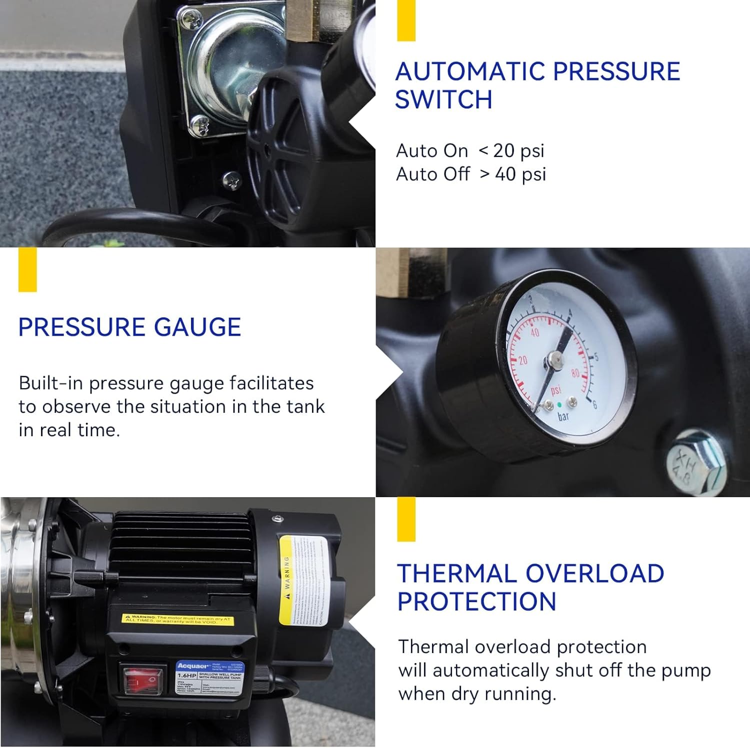 Acquaer 1.6 HP Shallow Well Pump with Pressure Tank, Stainless Steel, 1320 GPH 115V Irrigation, Automatic Water Booster Jet Pump for Home, Garden, Lawn