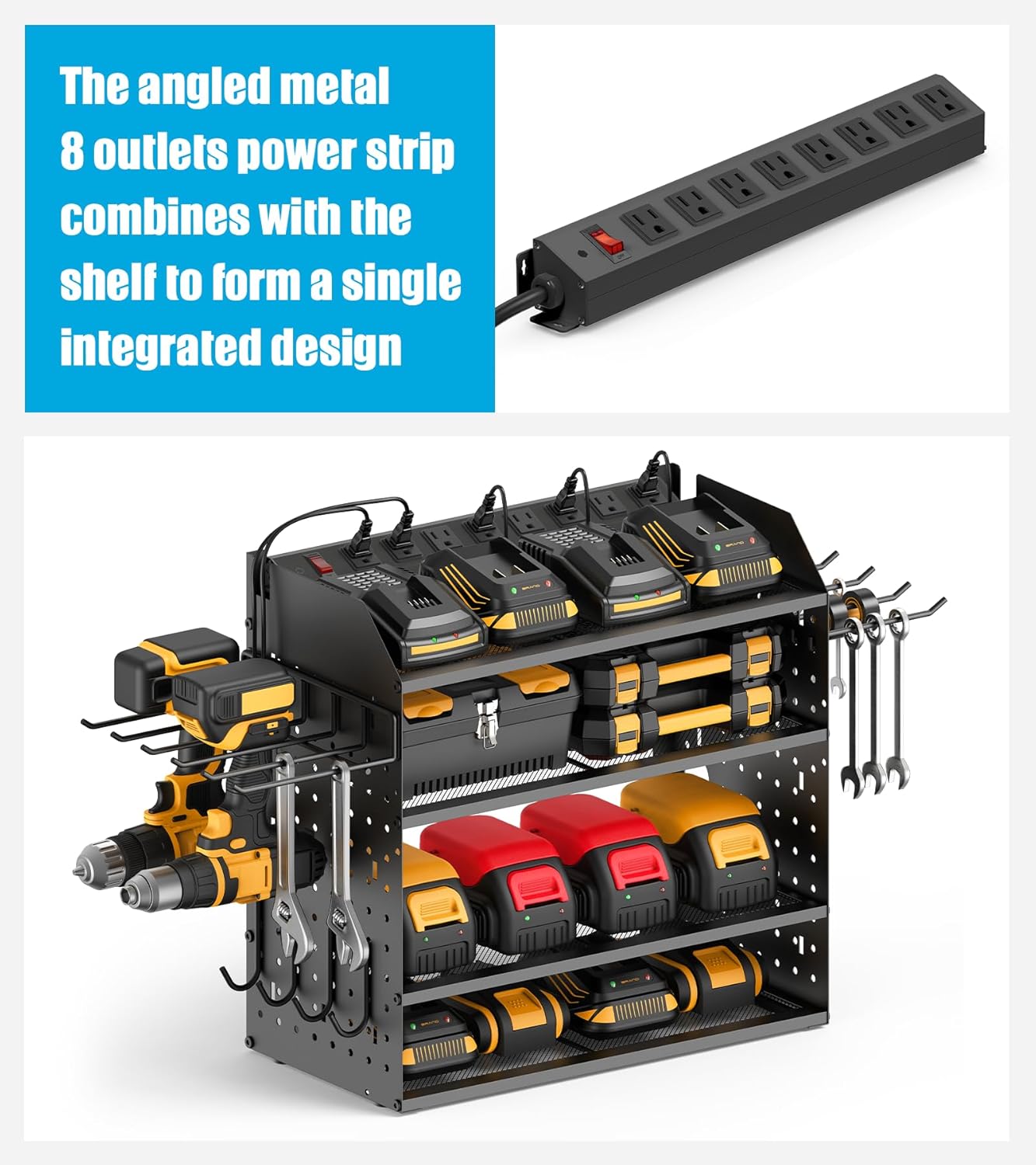 • Garage drill and battery organizer and storage, Includes 8 angled power outlets built into the organizer. Features side cord holes to run charger cables up to the top outlets for power. Hides and manages cords at the same time.