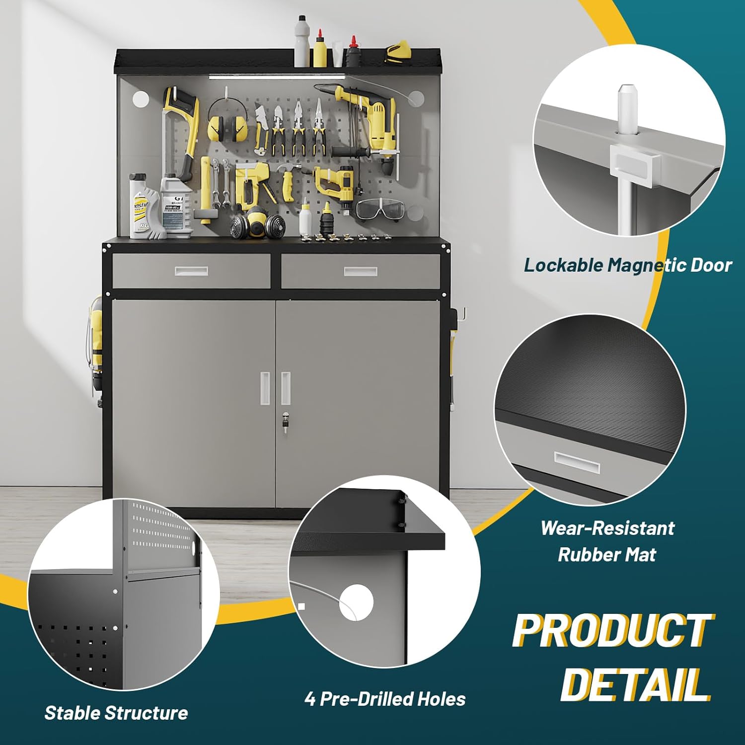 - Multi-Functional Storage Solutions:The metal tool bench has a pry-proof locking device enclosed main cabinet to keep valuable tools safe while keeping the work bench nice and neat. Dual drawers are designed to store screws, nuts and utility knives that can easily slip out of place. Three-sided pegboard supports 360° tool hanging system. Top 6"extension table for zero tool drop management and millimetre space utilisation.
