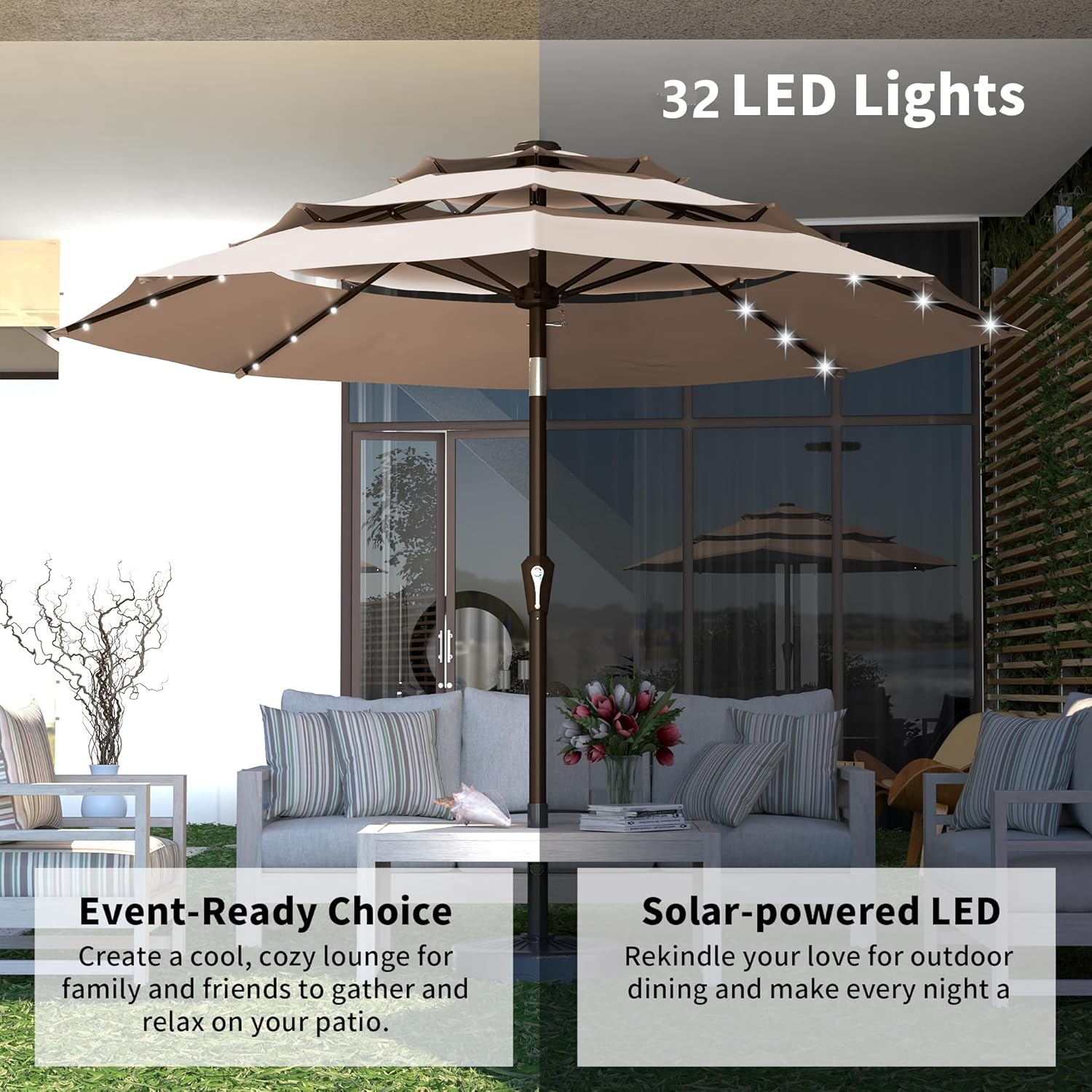 - ă32 Solar-Powered LED LightsăSuitable for use during both day and night, each rib is equipped with 4 bright LEDs and a solar panel on top for automatic charging. These energy-efficient and eco-friendly lights provide a warm and welcoming atmosphere for enjoyable evenings outdoors.