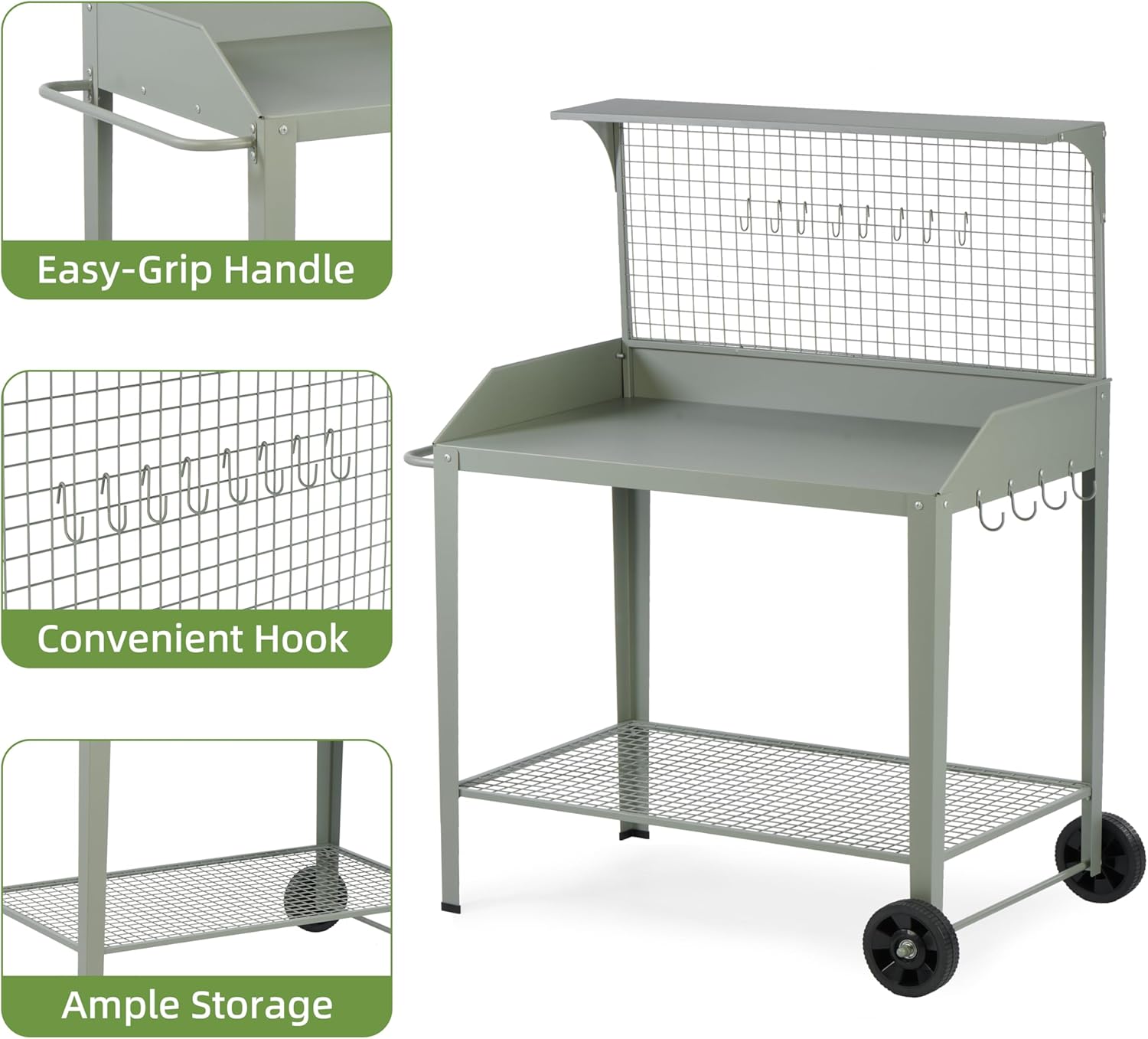 Outdoor Metal Potting Bench with Wheels, Heavy Duty Garden Workbench Table with Storage Shelf (Green, 52.8"x36.6")