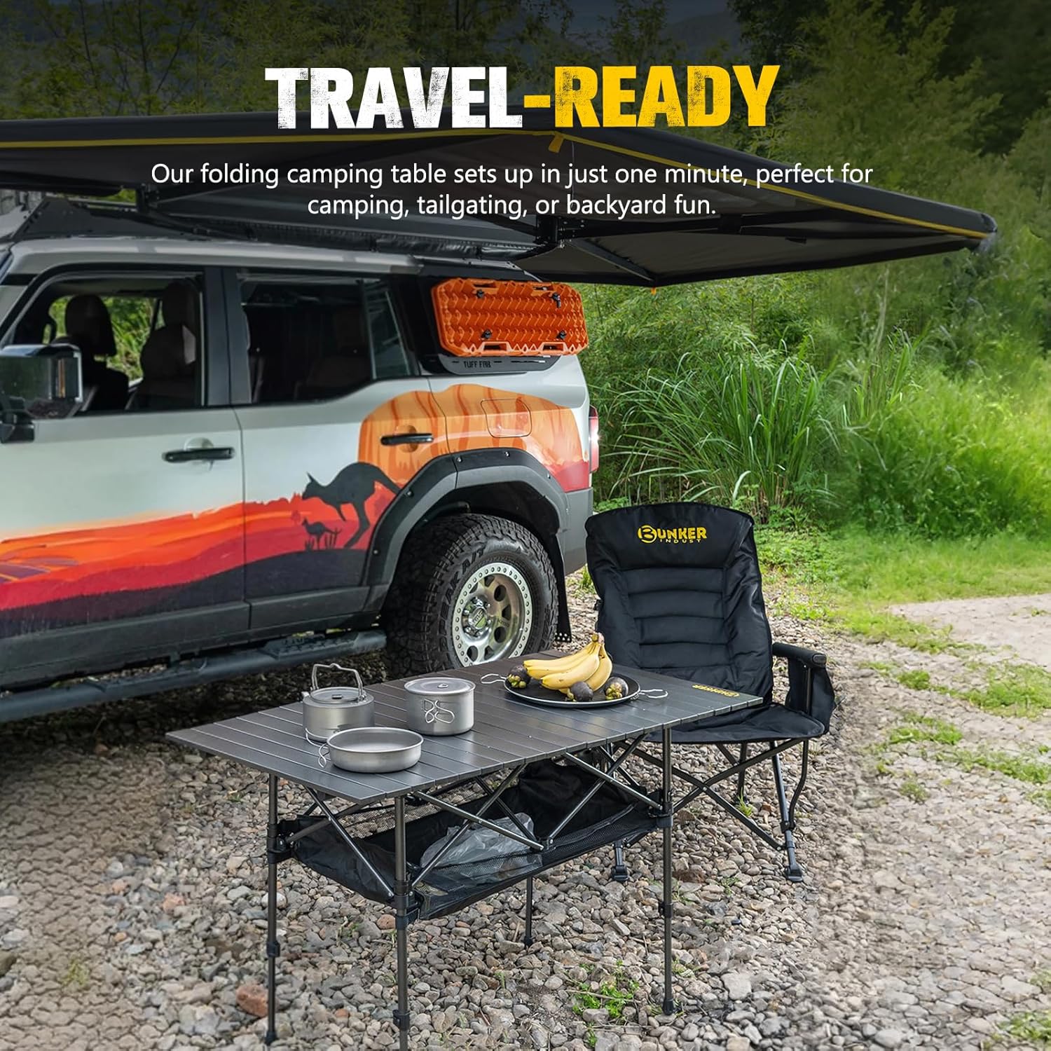 - Built Tough: Designed for the outdoors, our folding camping table features a rugged, powder-coated steel frame and legs for strength, plus a durable aluminum tabletop that resists rust and wipes clean easily. Lightweight yet strong, our portable camping table supports up to 110 lbs—perfect for meals, gear, or daily use wherever the adventure takes you.