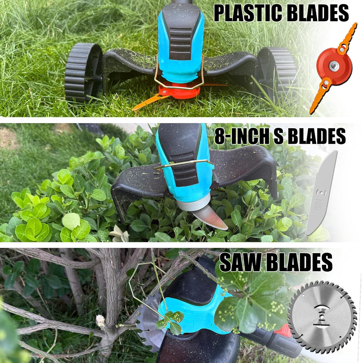 - 【3-IN-1 Battery Weed Wacker】 The weed wacker battery powered with 3 types of blades, which can easily cope with different scenarios. ①S-Manganese Steel Blade suitable for cutting thick weeds and hedges; ②Saw blade suitable for pruning branches or bushes; ③Plastic blades are only suitable for cutting tender grass. If your garden grass is very lush, it is recommended to use a metal blade directly. More professional tools can make your gardening work easier and more enjoyable