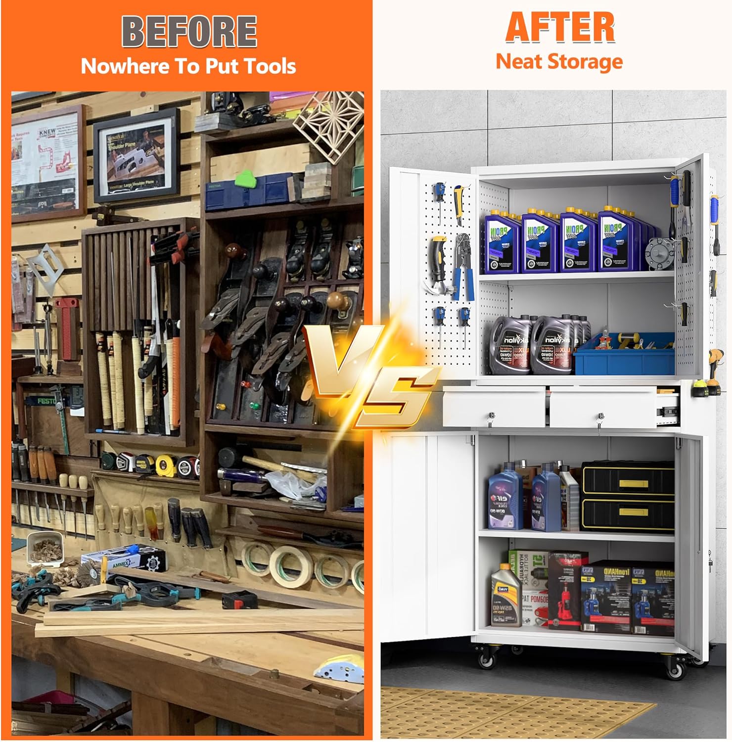 Aobabo Metal Storage Cabinet with 2 Locking Drawer and Pegboard, Steel Rolling Tool Cabinet with 8 Hooks and 2 Adjustable Shelves for Garage, Home, Office, Kitchen Assembly Required, White