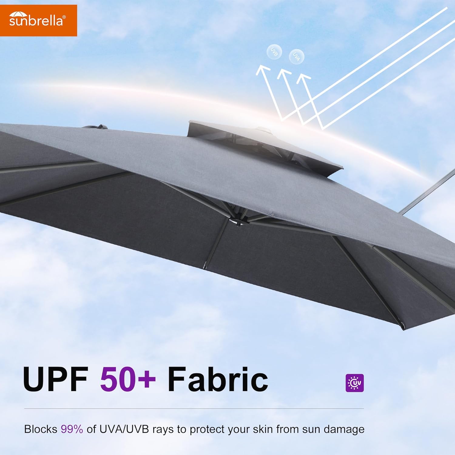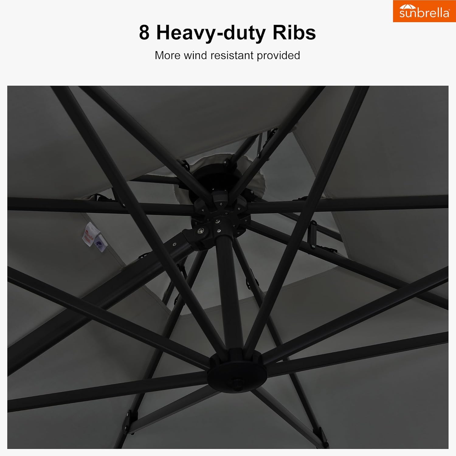 - Sturdy Aluminum Construction: Featuring a full aluminum frame with powder-coated finish and 8 heavy-duty ribs, this cantilever umbrella is designed for strength and longevity, ensuring reliable support and enduring performance.