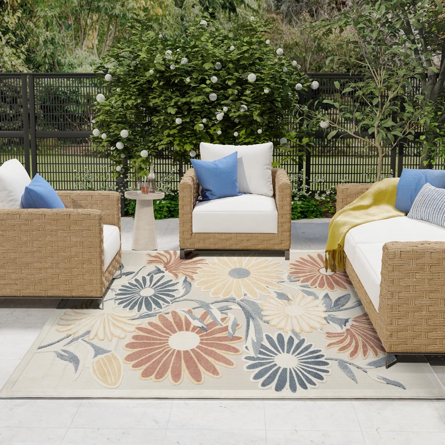 - Floral outdoor rug adds a subtle sense of depth to your space