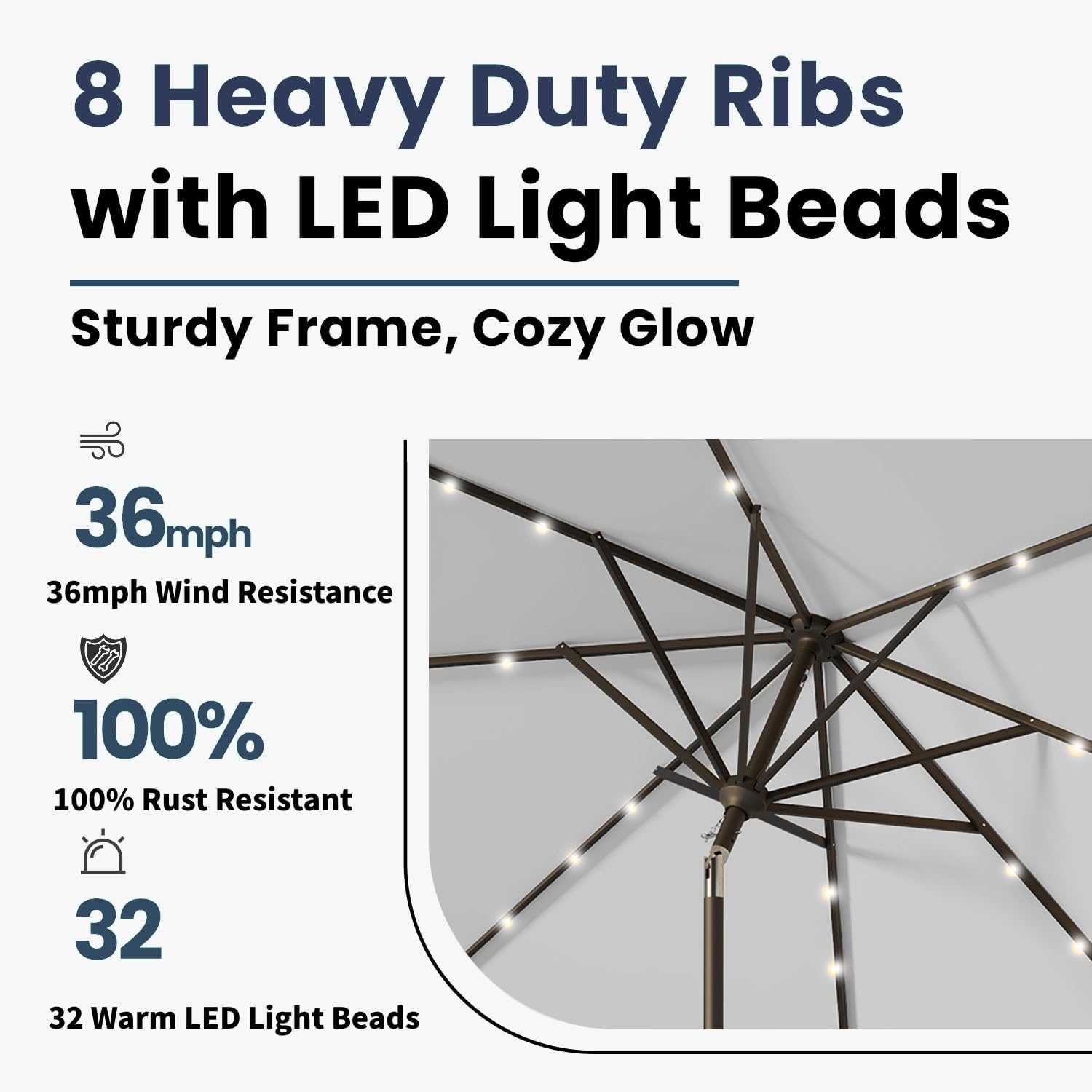 - 32 Solar-Powered LED Lights: Illuminate your evenings with 32 built-in LED lights powered by a high-efficiency solar panel, without the need for external power sources, providing up to 8 hours of ambient lighting.