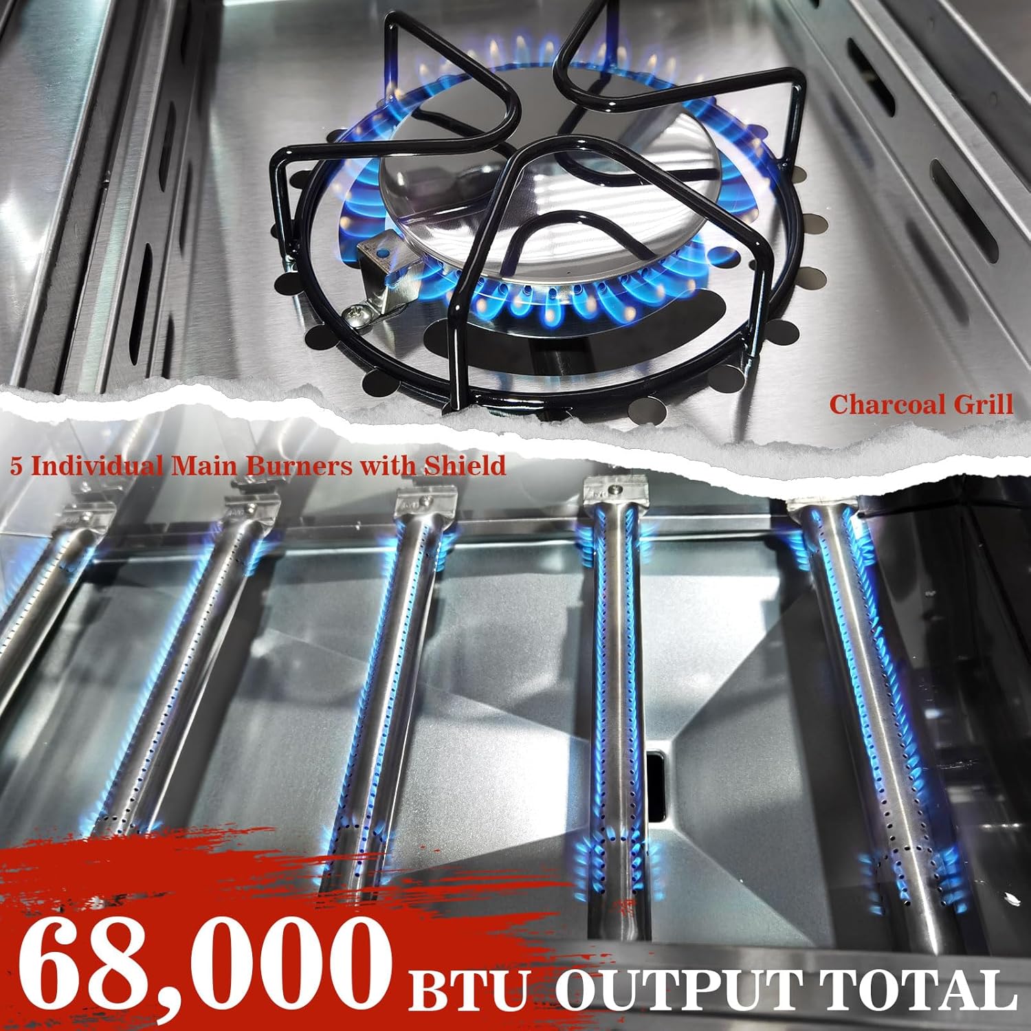 - đ„ ăCommercial-Grade 6-Burner Systemă 5 main burners (60,000 BTU) + 1 dedicated side burner (8,000 BTU) delivering 68,000 BTU total power. Upgraded Convenience: Includes removable grease tray, tool hooks, and a bonus food clip for mess-free maintenance and versatile cooking (searing, simmering, sauce warming).