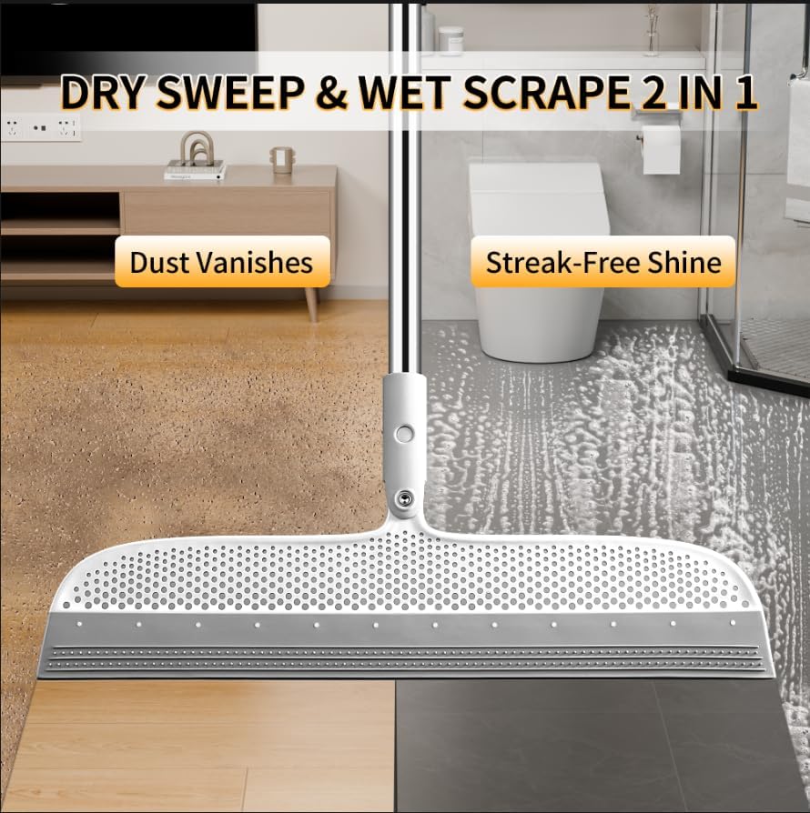 - 【3-in-1 Floor Warrior】Combines sweeping and floor squeegee functions in one rubber broom. Rust-proof stainless steel + thick TPR blades power through dust, hair, and spills. 15.7" wide head tackles dust, hair, and spills without static cling.