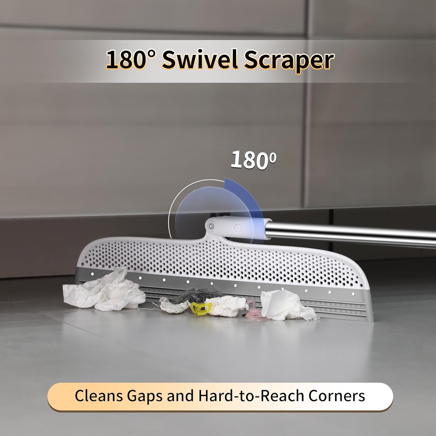 - 【180-Degree Maneuverability】The swivel head on this squeegee broom pivots to clean tight spaces regular brooms miss. Easily reach under furniture and into corners with the flexible rubber broom design.