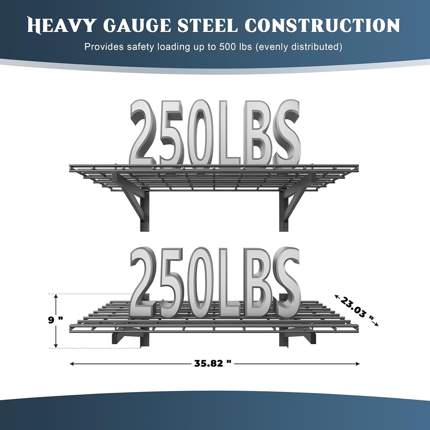 - 🏆【Heavy-Duty Load Capacity】- Jusgym garage shelving wall mounted system is engineered with premium steel, offering exceptional strength. Each 2x3ft bracket holds up to 250 lbs, and with 2 shelves totaling 500lbs capacity, it effortlessly stores bulky items like tools, tires, and heavy storage bins. Built to last, even under extreme weight!