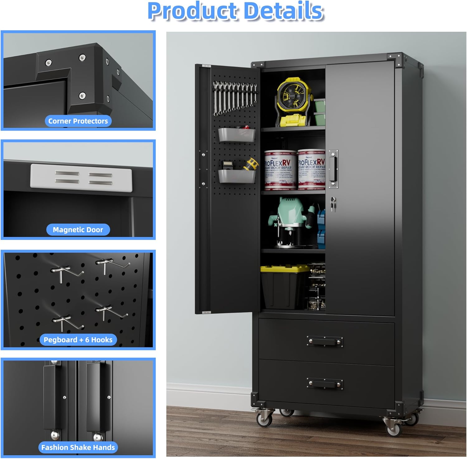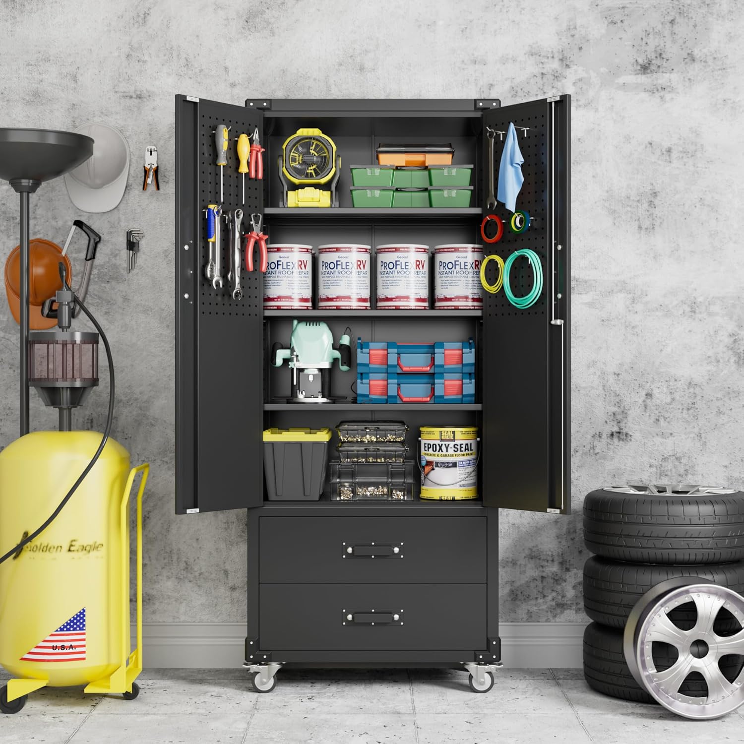 Upgraded Metal Garage Storage Cabinet with Wheels and 2 Drawers, Rolling Tool Cabinet with 3 Shelves and Pegboard Behind The Door for Home Office Garage,Assembly Required,Black