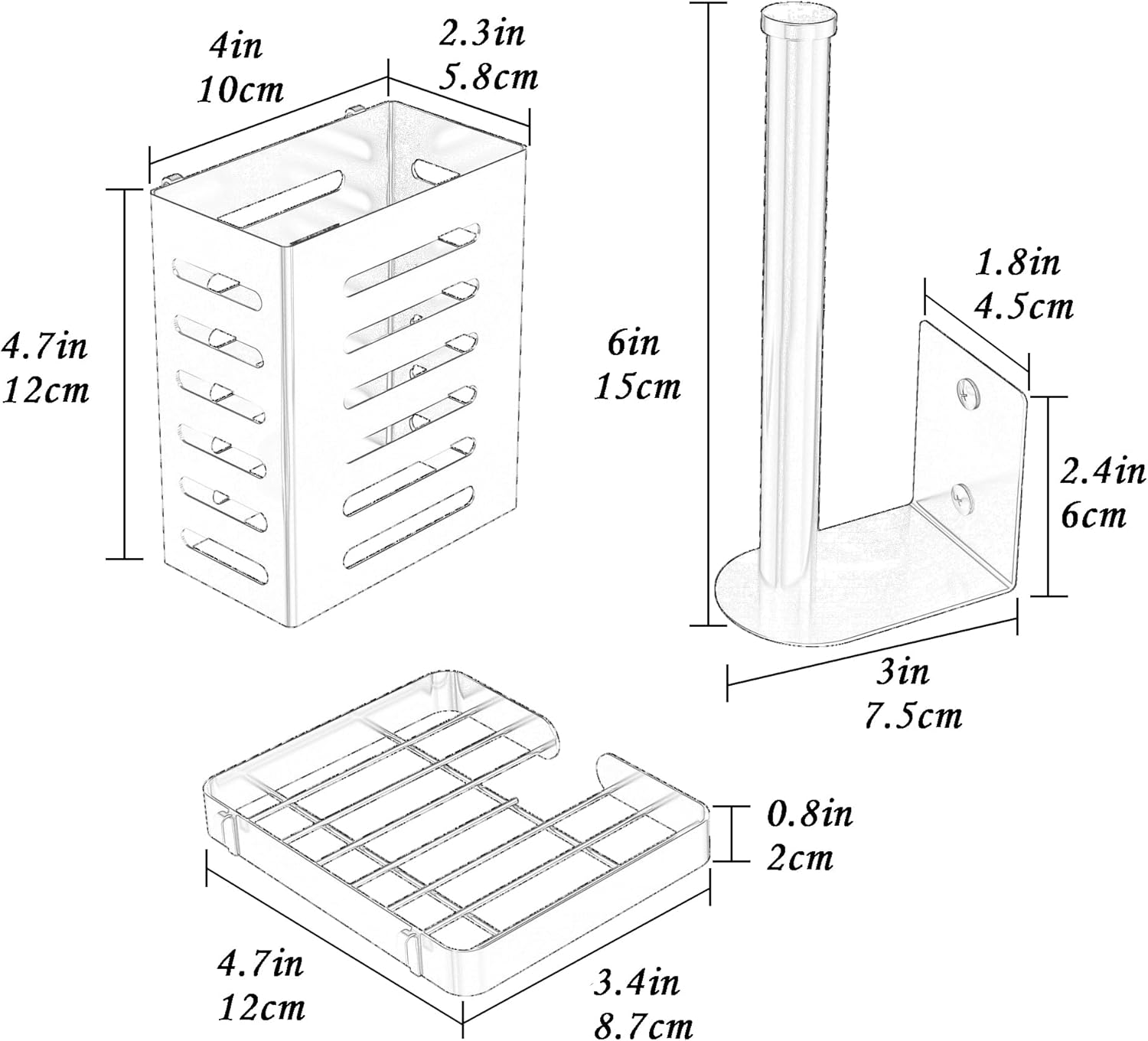 - 【MULTI-PURPOSE&MULTIFUNCTIONAL】5 Hanging Storage Baskets Organizer Set for Sufficient Bathroom Kitchen Storage Space, The bathroom&Kitchen organizer comes with 5 pieces for different uses, including 2 Hanging Storage Baskets, 1 soap holder,1 Tissue holder ,1 utensil holder and 2 adhesives. The perfect solution for organizing a multitude of every items indoor or outdoor. The cabinet organizer hanging baskets wall mount is Ideal for organizing and storing spice bottles, pantry items, snacks, toiletries, tools, craft supplies,etc. And this metal bin basket free up enough space for your homes, kitchen, living room, bathroom, camper, farmhouse, apartments, college dorm rooms, etc.