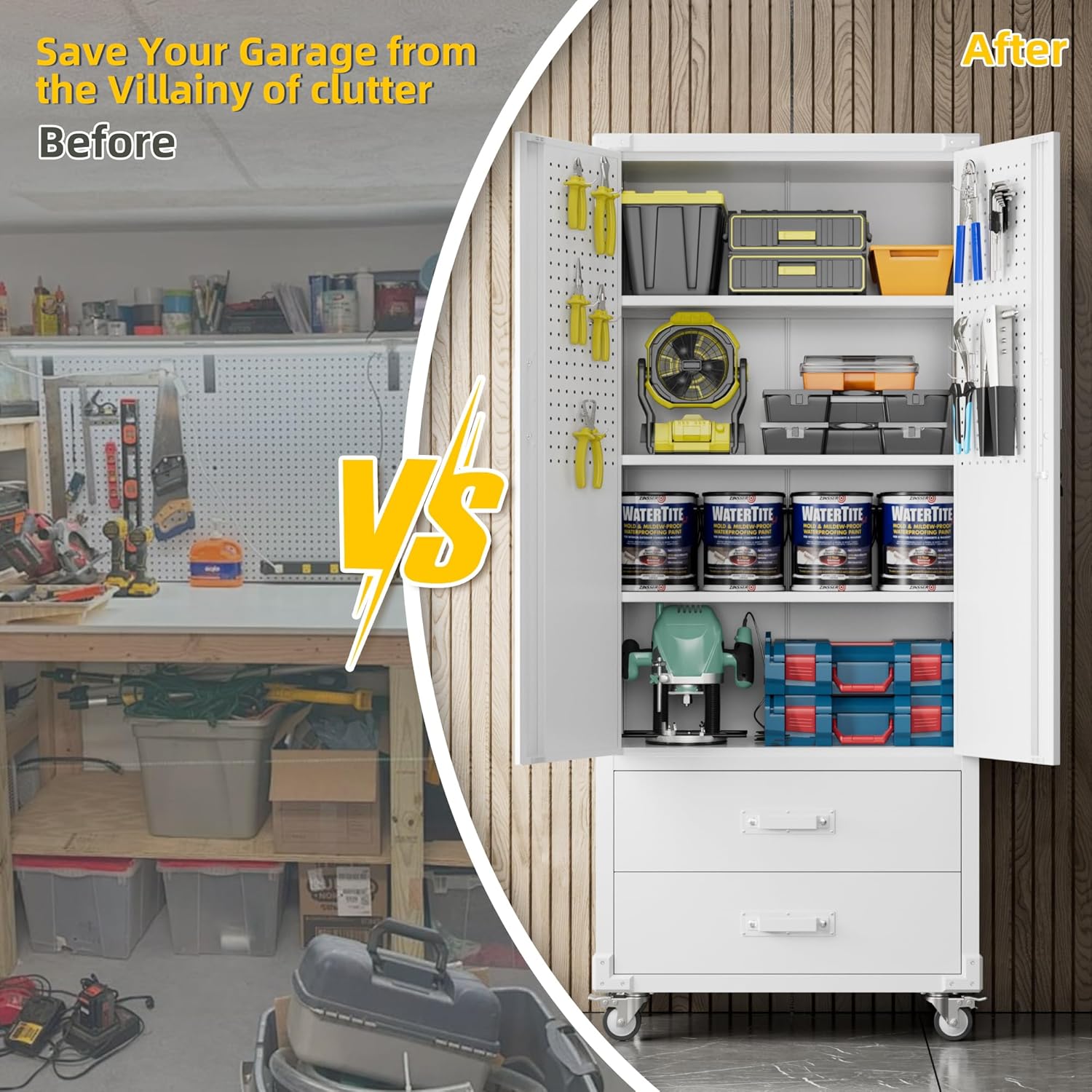 - 【Upgraded Design & More Space】Storage cabinet offers plenty of space to meet your storage needs. There are pegboard on the cabinet 2 doors and it has 6 hooks and can be used to hang objects. The two drawers at the bottom can store sundries or documents.