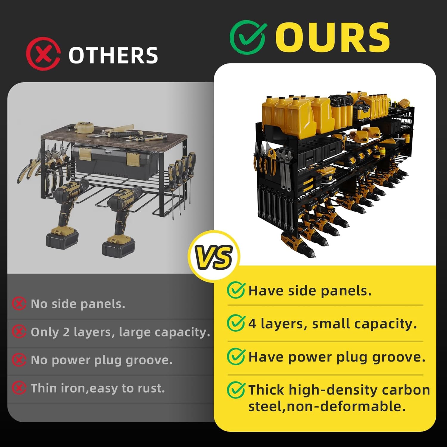 - 🔨【800 POUNDS LOAD】This heavy-duty power tool organizer is made of heavy-duty metal and protective coating,scratch-resistant, rust-resistant and anti-bending,no need to worry about the shelf breaking or falling off the wall. The wall mount design saves valuable floor space while keeping tools within reach,say goodbye to a messy workspace,put your tools all in a row.