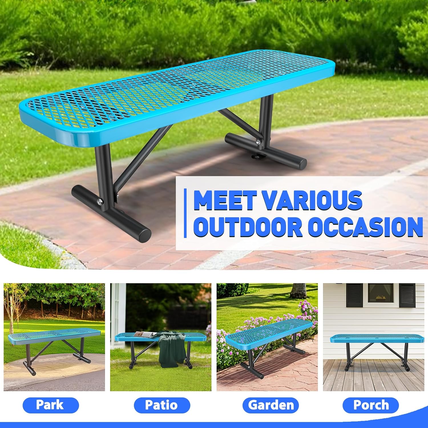 - Superior Craftsmanship: This 6 FT heavy duty park bench, sized at 48"-96”L x 23.2”W x 32.5”H, comfortably accommodates 2-7 people. Featuring a mesh cut-out design on the seat, it ensures both comfort and reduced weight, while stabilizing triangular supports provide a smooth seating experience.