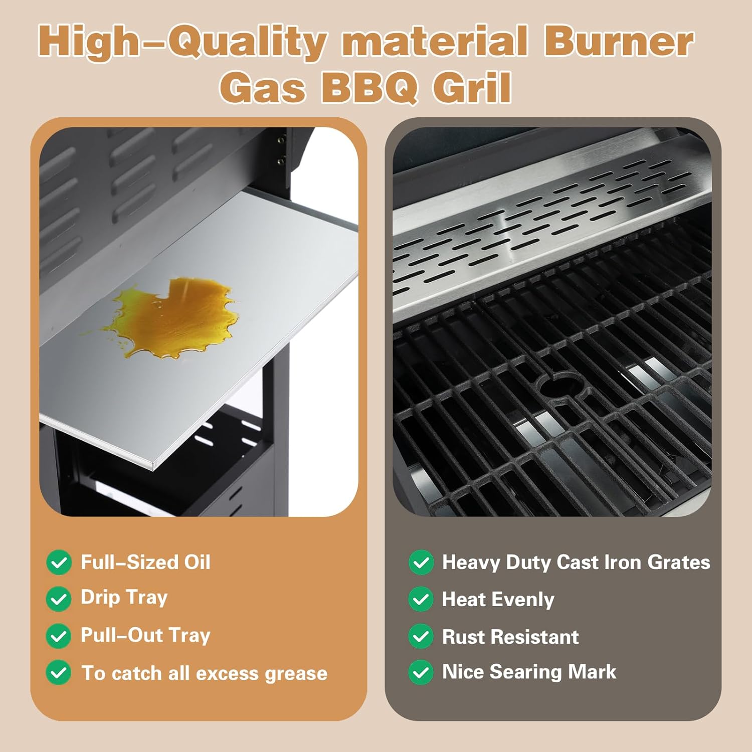 - Easy to assemble and clean: The modular design makes assembly simple and quick, without complex tools, saving time and effort. The removable grease collection tray makes it easy to clean grease and food residues, keeping the barbecue grill clean and hygienic, and making the cooking environment tidier.