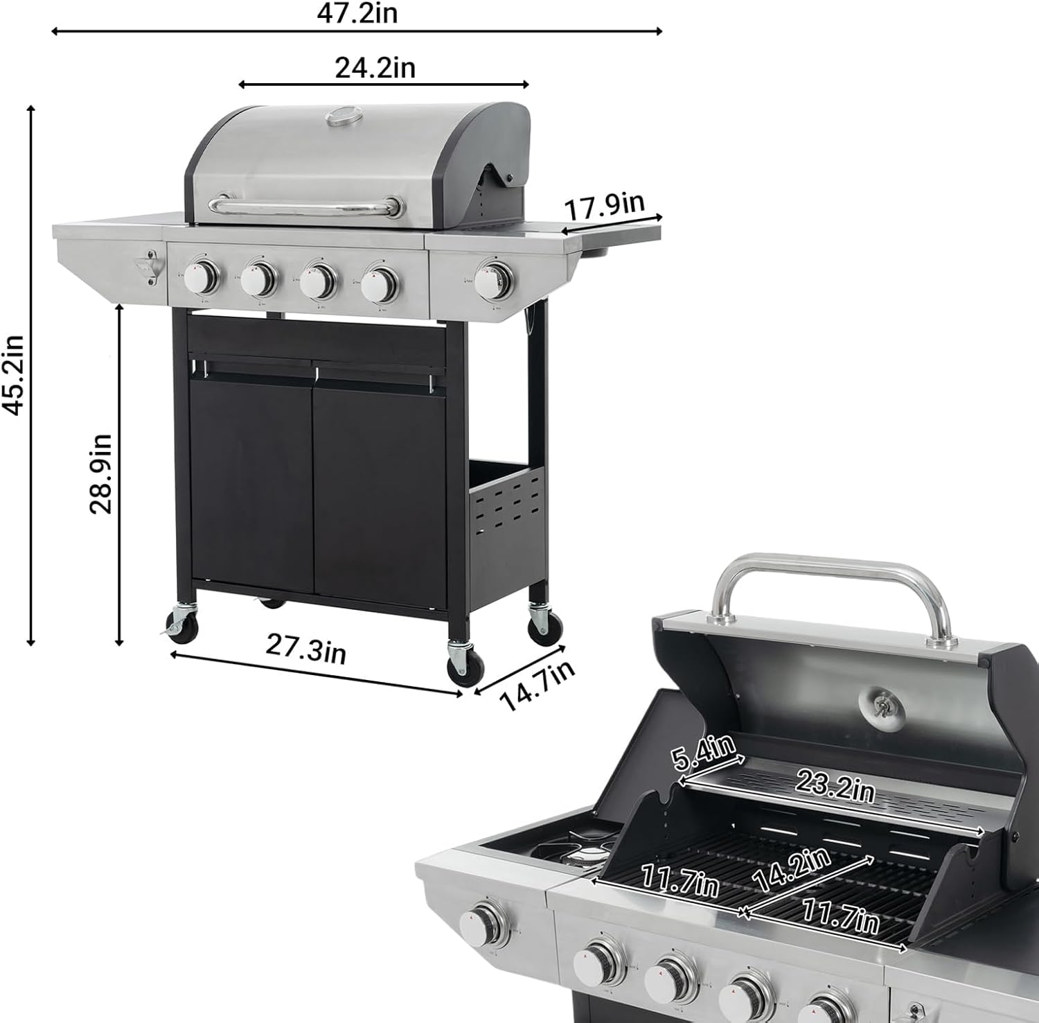 Endark 4-burner propane gas grill | Stainless steel construction | Dual side racks and wheels | Designed for patio, garden, and backyard cooking