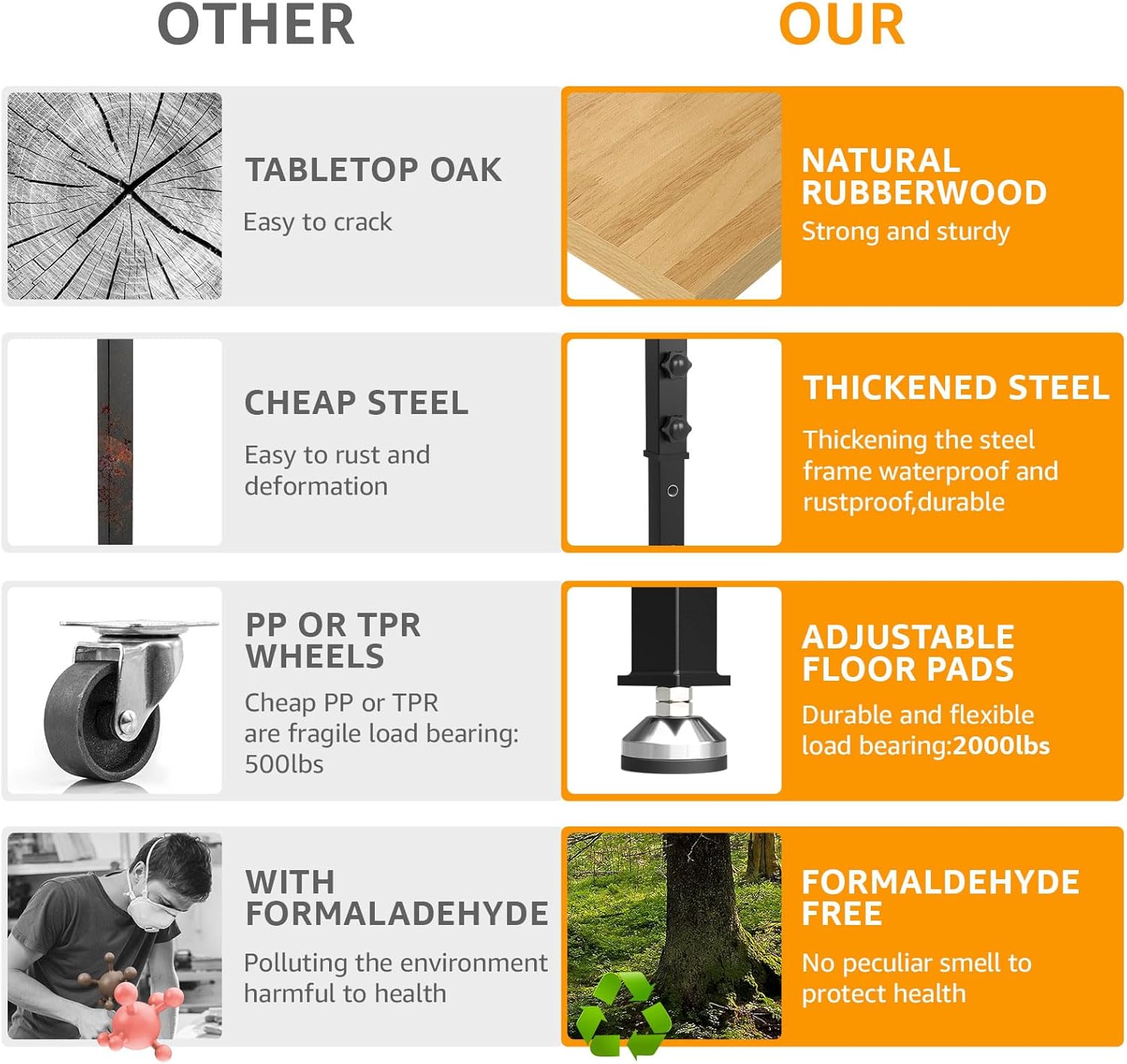 - Stable Construction:The frame of the work table is made of cold-rolled steel plates, which are very sturdy. Several thick crossbars keep the table stable when loaded.Meanwhile, the adjustable workbench is equipped with 4 rubber feet,effectively stopping it from sliding and protecting your floor. Moreover, all accessories, required tools, and detailed installation instructions are included, making it easy to assemble the heavy-duty workbench.