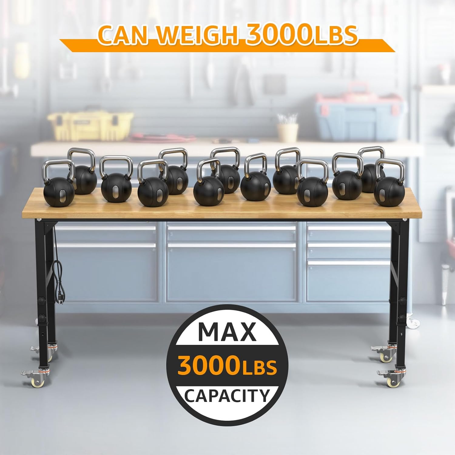 70" Adjustable Workbench,Heavy-Duty Work Table,3000 LBS Load Capacity Hardwood Workstation Outlets with Power Strips, Drawers and Wheels,for Workshop, Garage