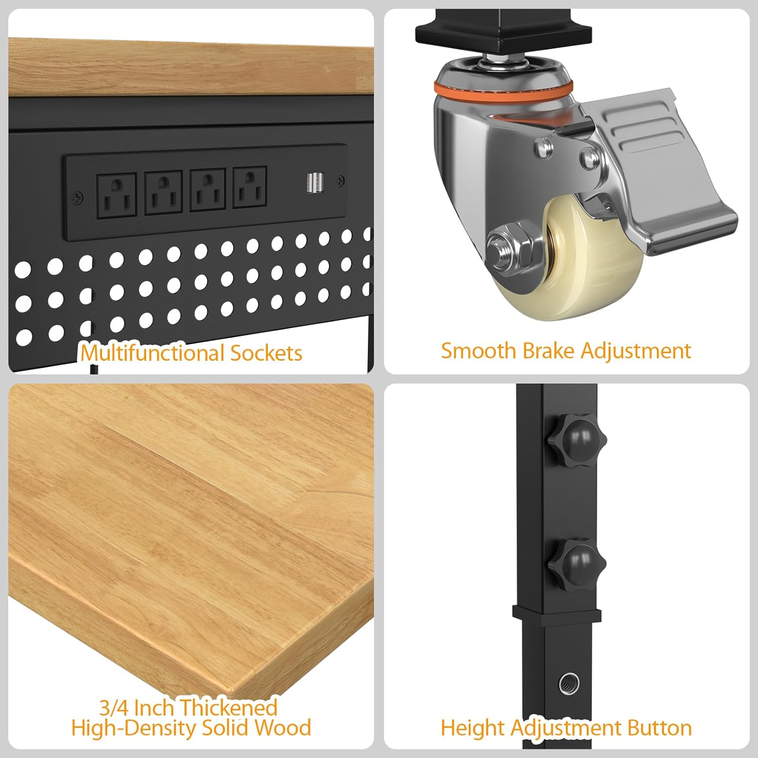 - Stable Construction&Convenient to move:The frame of the work table is made of cold-rolled steel plates, which are very sturdy.Several thick crossbars keep the table stable when loaded. With four heavy-duty 360° locking casters, moving becomes effortless, providing mobility for your workstation anywhere.Moreover, all accessories, required tools, and detailed installation instructions are included, making it easy to assemble the heavy-duty workbench.