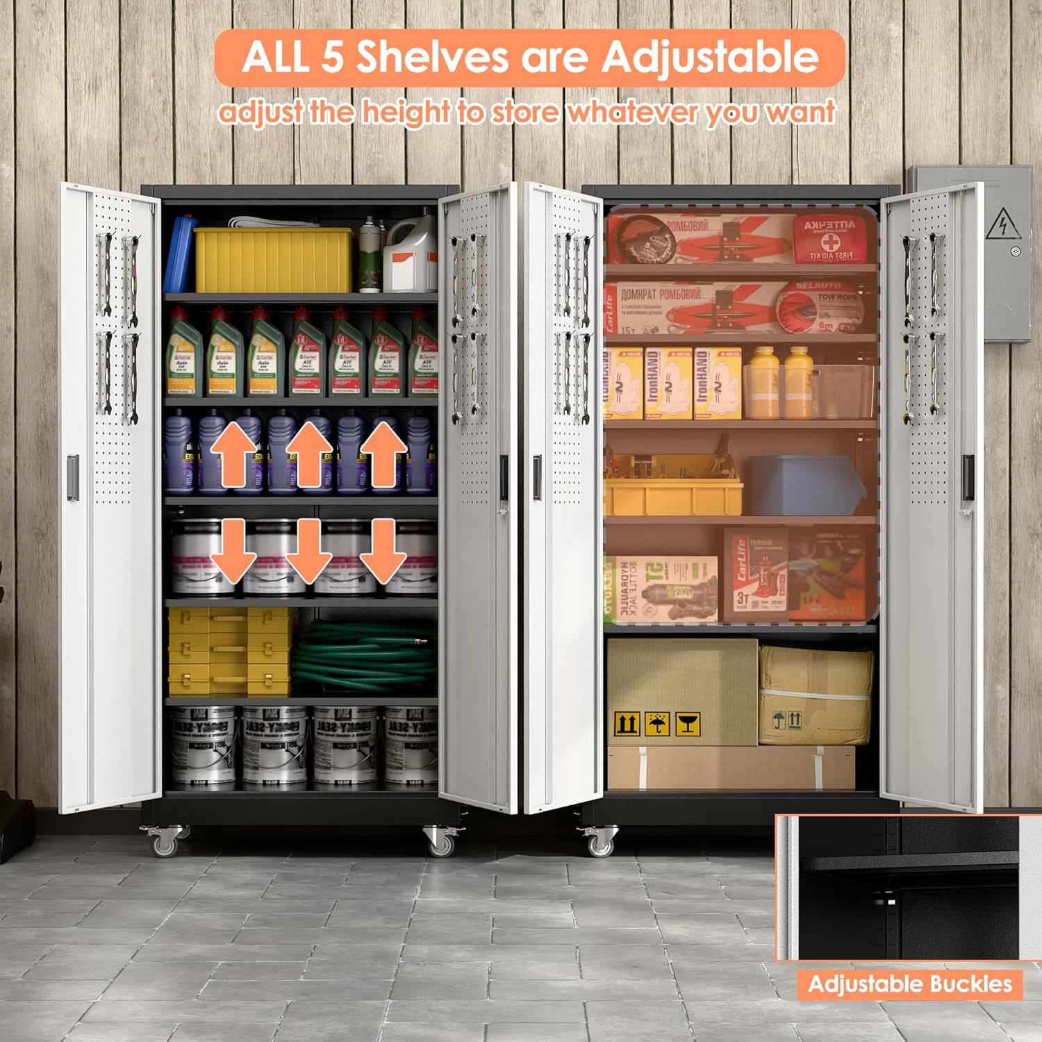 - Storage Cabinet for Garage : Steel storage cabinet is equipped with 5 adjustable shelves, which can be adjusted in increments of 2 inches to accommodate items of different heights. Each shelf holds 120 lbs, perfect for storing household or garage items, supplies, tools, files and more