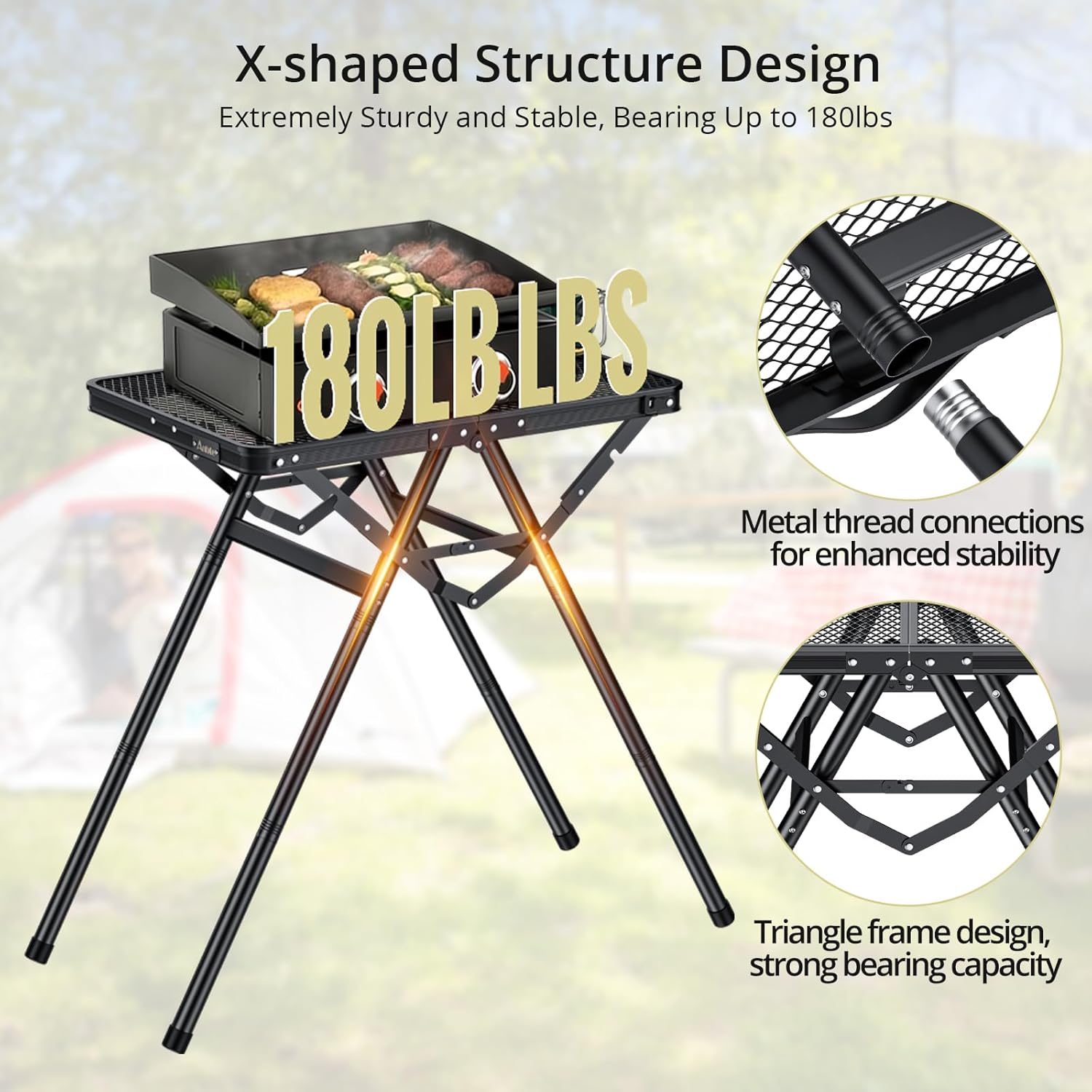 - X-Shaped Structure Design, More Sturdy and Stable: Anbte portable grill table feature a newly upgraded X-shaped structure design with a load capacity of up to 180 pounds, making them extremely sturdy. The table legs are connected with a spiral design, ensuring that they are tightly connected for enhanced stability and preventing wobbling