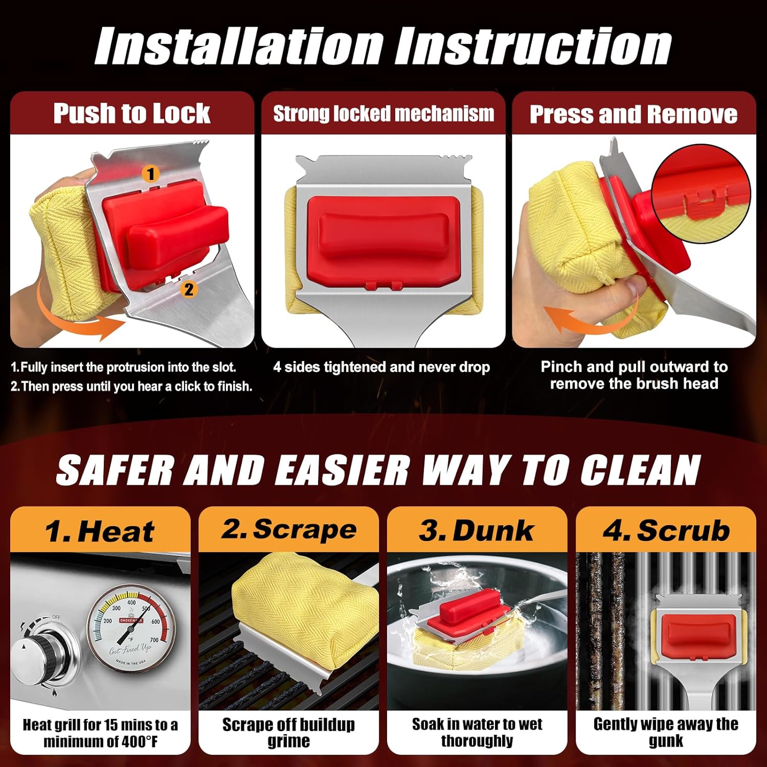 - [Replaceable brush head]: Grill brush bristle free has four snaps to secure it and will not come off easily. The removed brush head is dishwasher safe. Note: Other brands of cleaning brush heads cannot be used