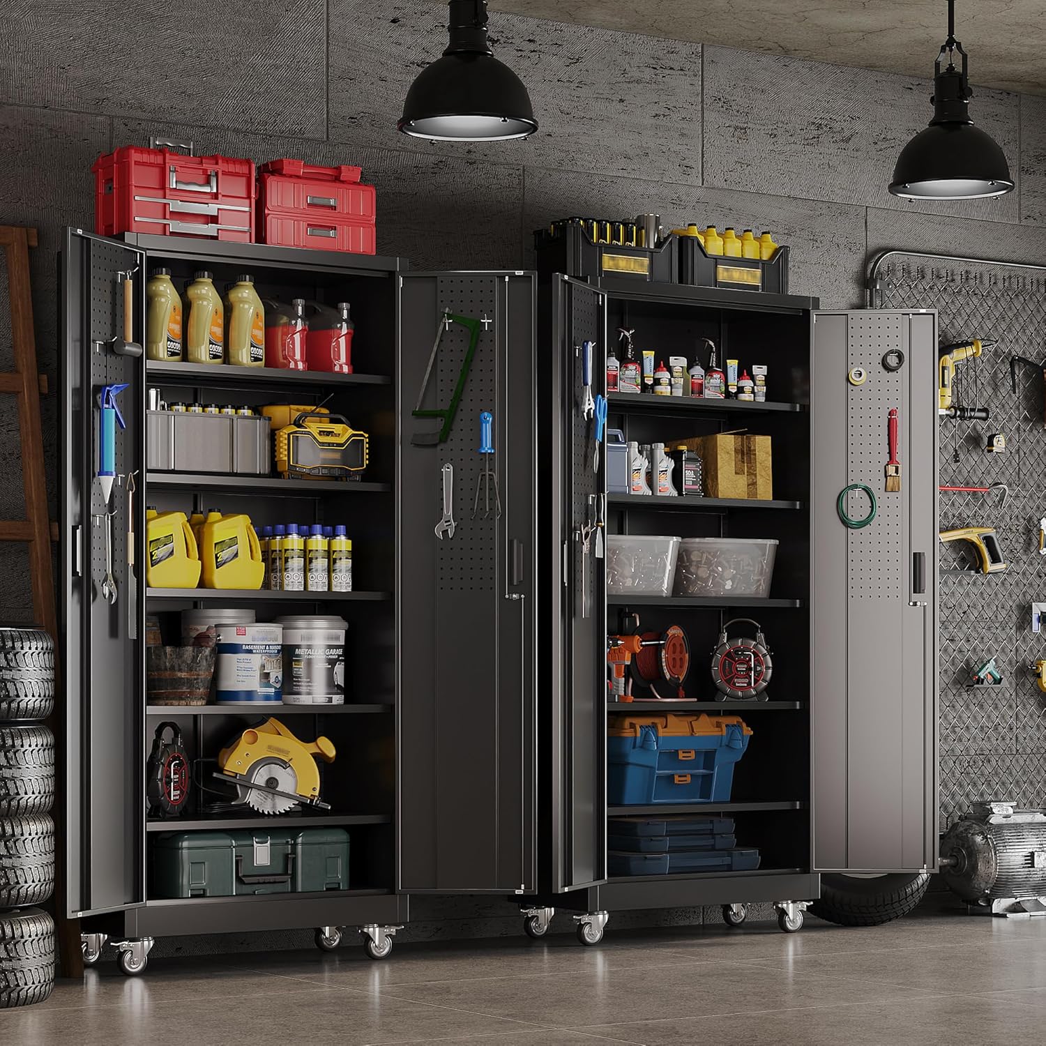 - Metal Storage Cabinet : Metal storage cabinet has 5 adjustable and removable shelves that can be adjusted while ensuring maximum adaptability and convenience to meet your own unique storage and organization needs. Metal storage cabinet have 2 round pegboards and 4 hooks, and if you need more you can easily buy more suitable hooks