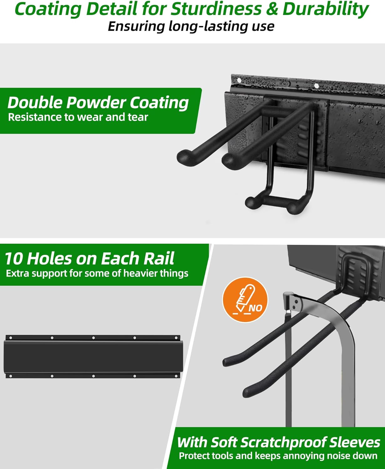 - Easy Installation: Comes with all necessary hardware for quick and easy wall mounting, you can customize apart or together if needed. Adjustable hooks make the garage organizer easy to fit big & small items. Great organizer for garden and lawn tools