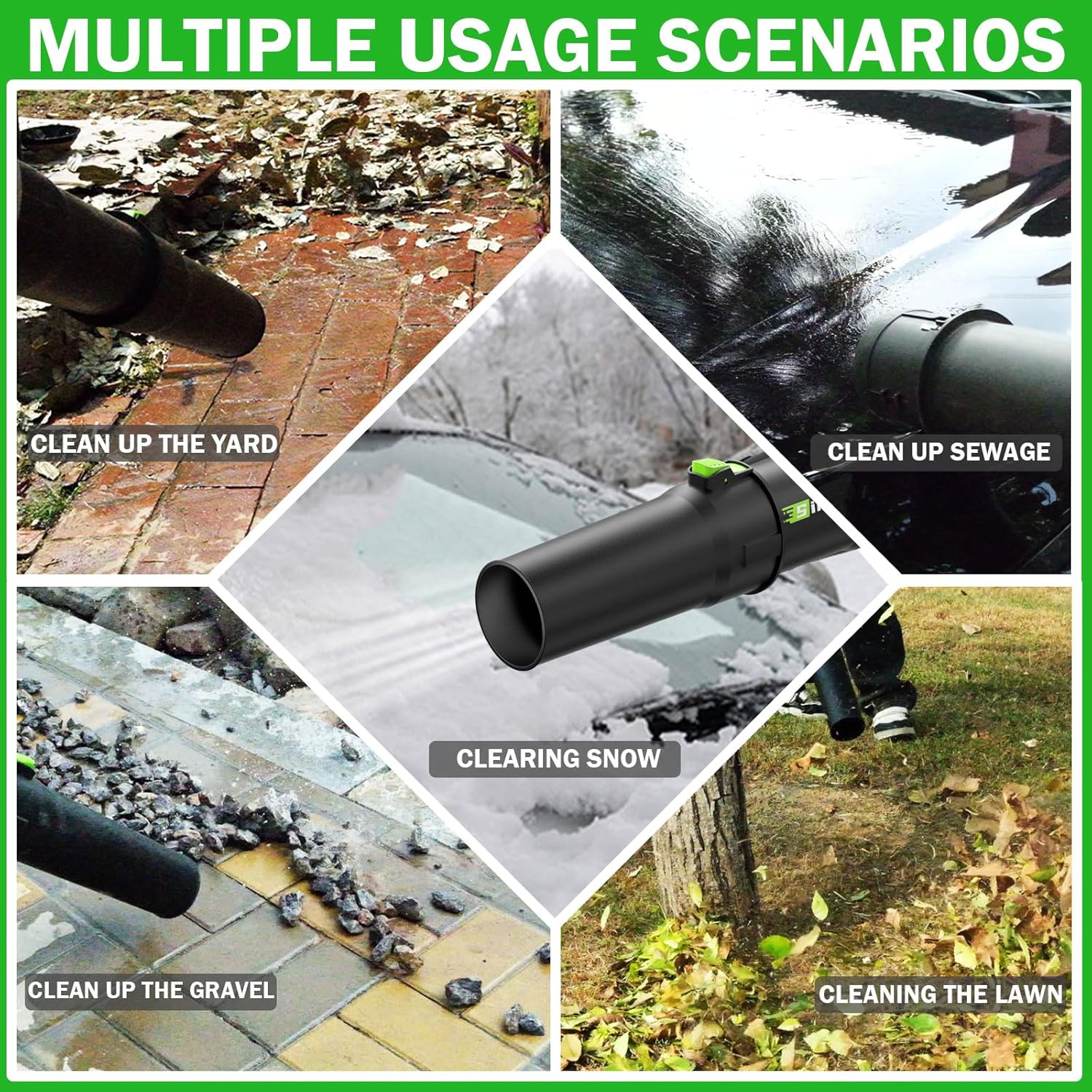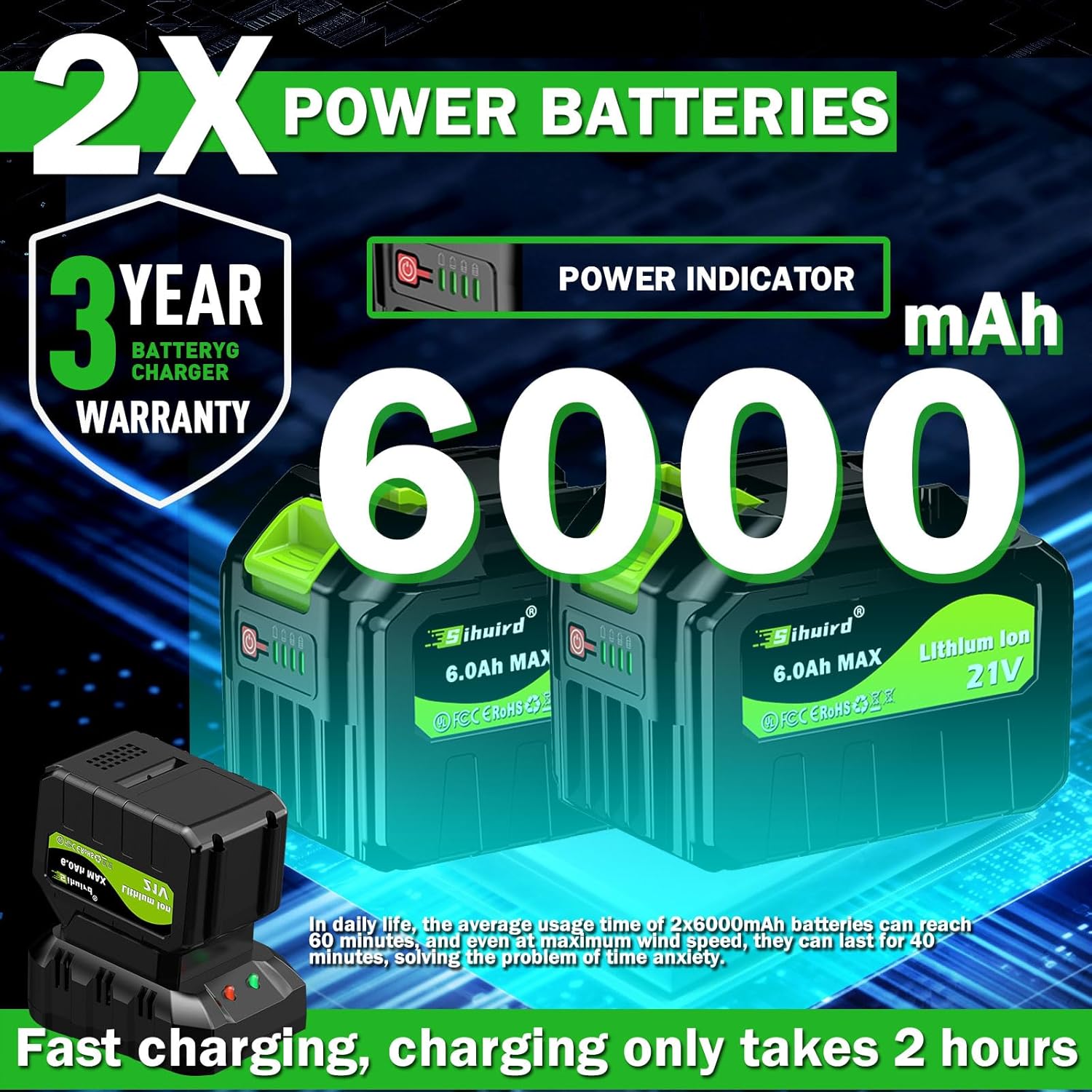 - ăUpgrade to 2x6.0Ah Batteriesă:Sihuird Cordless Leaf Blower Equipped with 2x6.0Ah batteries and a fast charger, In daily life, the average usage time of 2x6000mAh batteries can reach 60 minutes, and even at maximum wind speed, they can last for 40 minutes, solving the problem of time anxiety.