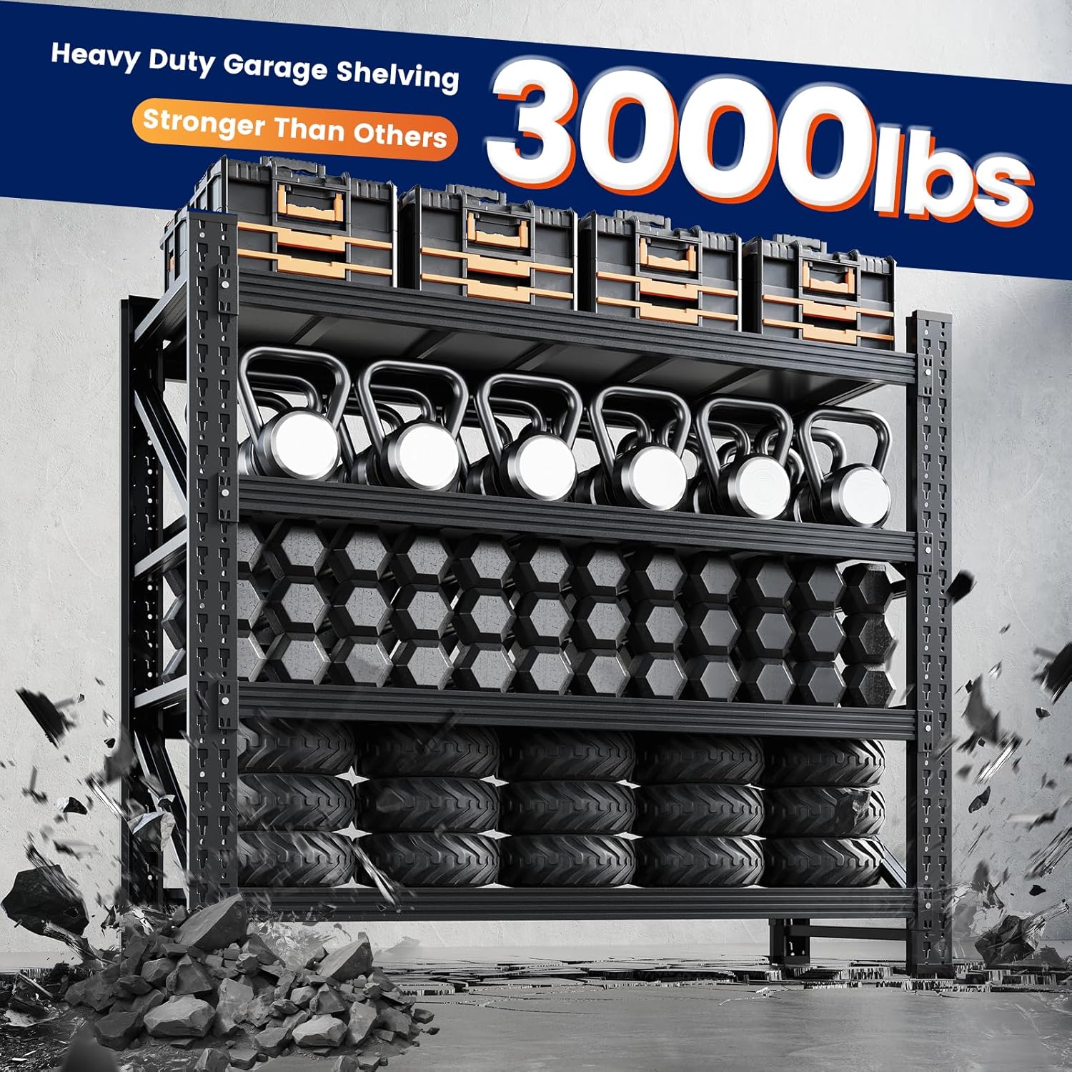 - ă 70" H Garage Shelving Heavy DutyăThis heavy-duty garage storage shelving featuring one-piece columns that are seamlessly constructed,Made of high-quality metal frame,very sturdy and enduring,each shelf can hold up to 440 lbs,treated with an anti-corrosion coating,allowing you to use the garage shelving for a long time.