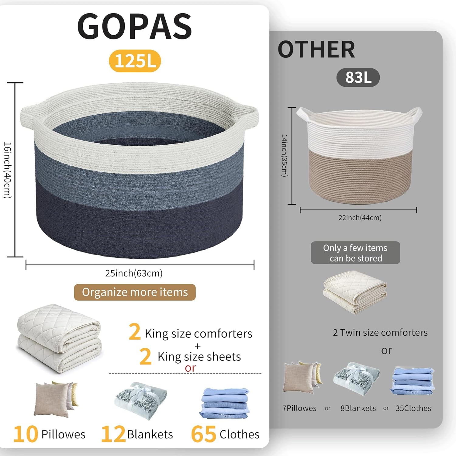 125L Extra Large Blanket Basket, 25" x 16", Jumbo Laundry Woven Basket Decorative Home, Cotton Rope Basket with Handles, Baby Toy Basket for Storage, Gradual Blue