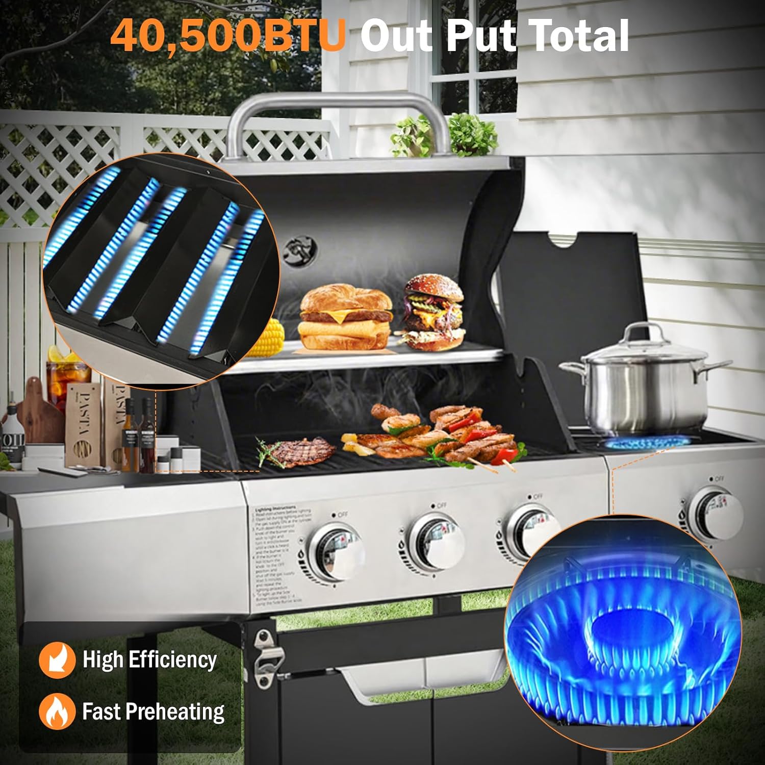 - 【Powerful 4-Burner Performance】40,500 BTU output with 3 main burners + sear burner. Stainless steel construction ensures durability while wind-resistant burners maintain consistent flames. Includes grease management system for easy cleanup. Perfect for searing steaks or simmering sauces.