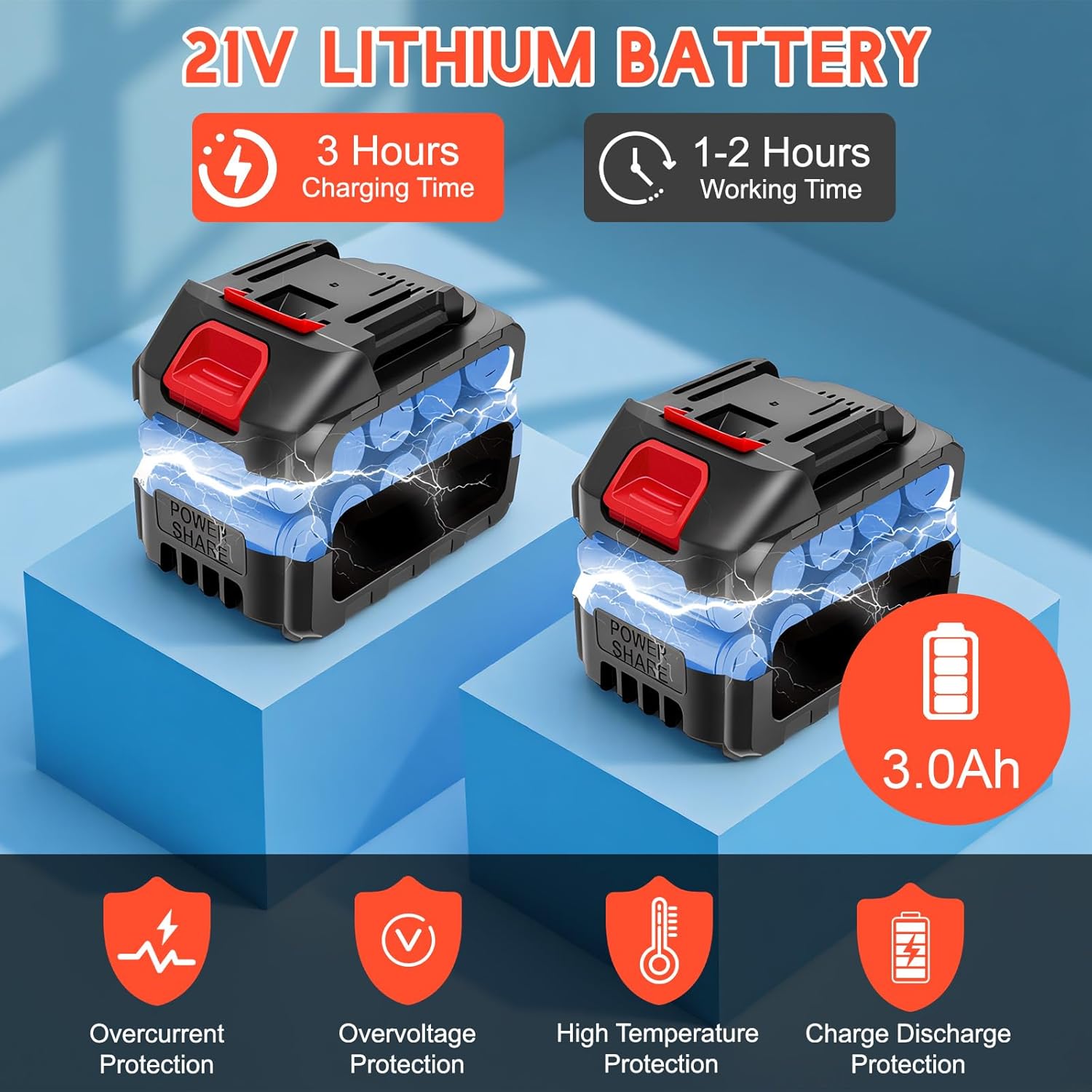- Powerful 3.0Ah battery for extended runtime: The Electric Handheld Bush Clipper Equipped with two large-capacity 21V 3000mAh lithium-ion battery, it can be fully charged in just 3 hours, providing up to 90 minutes of continuous trimming
