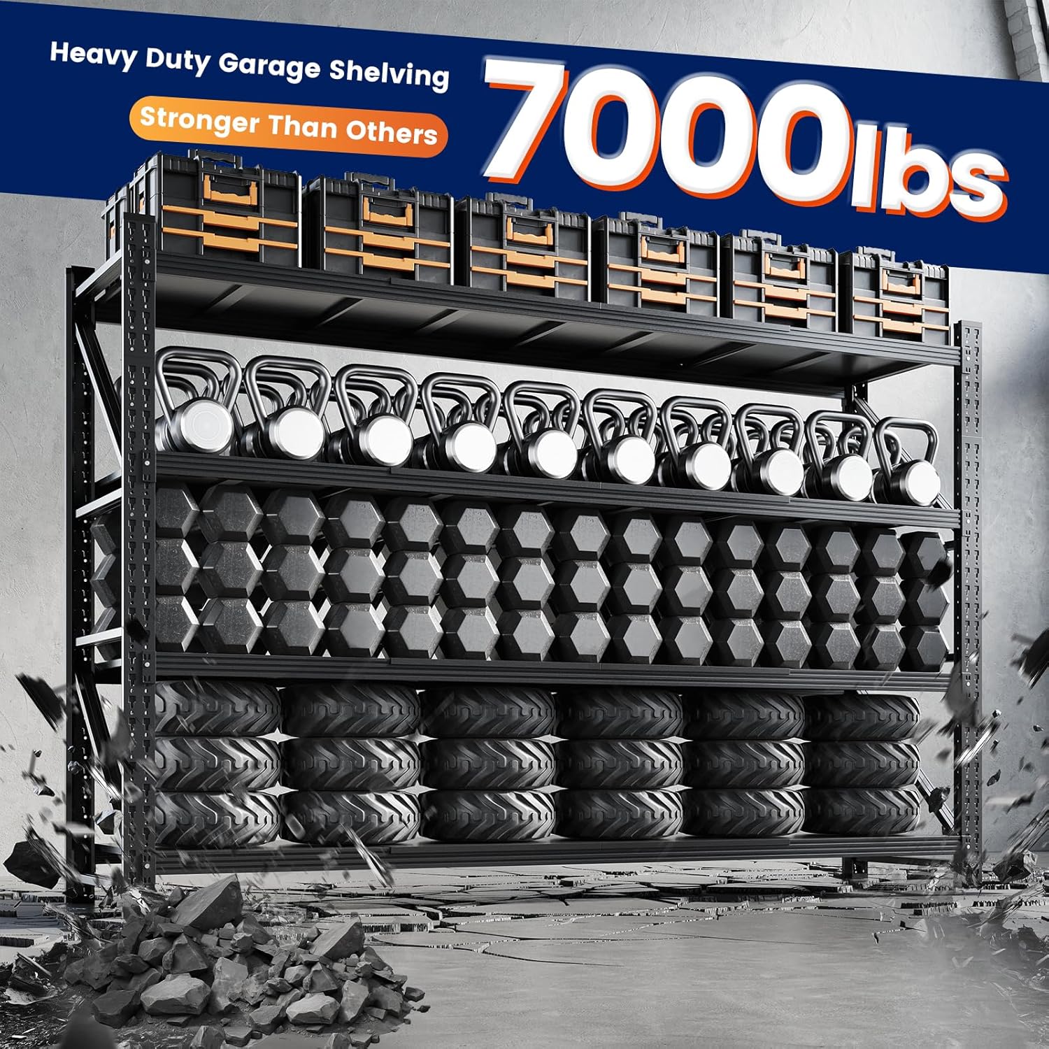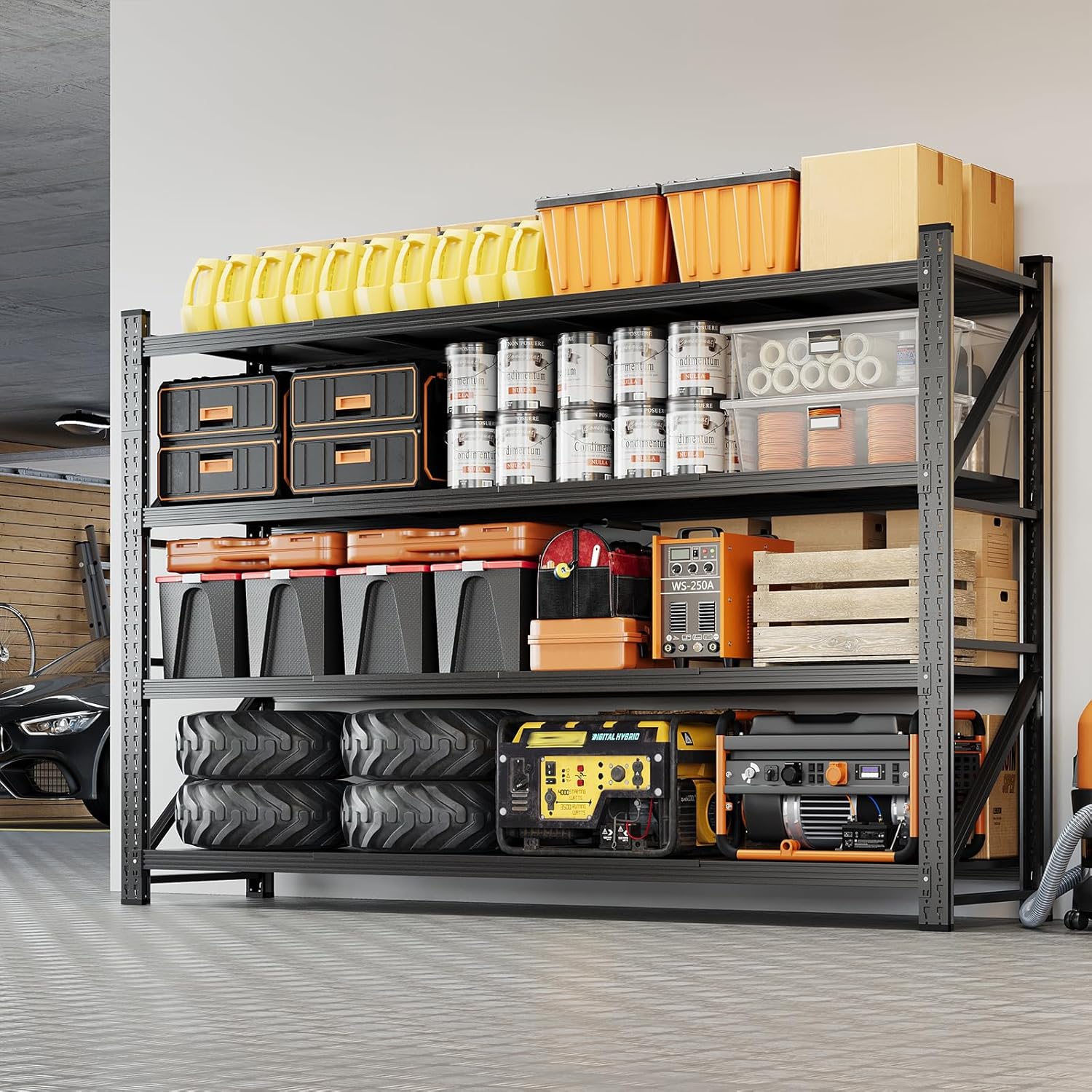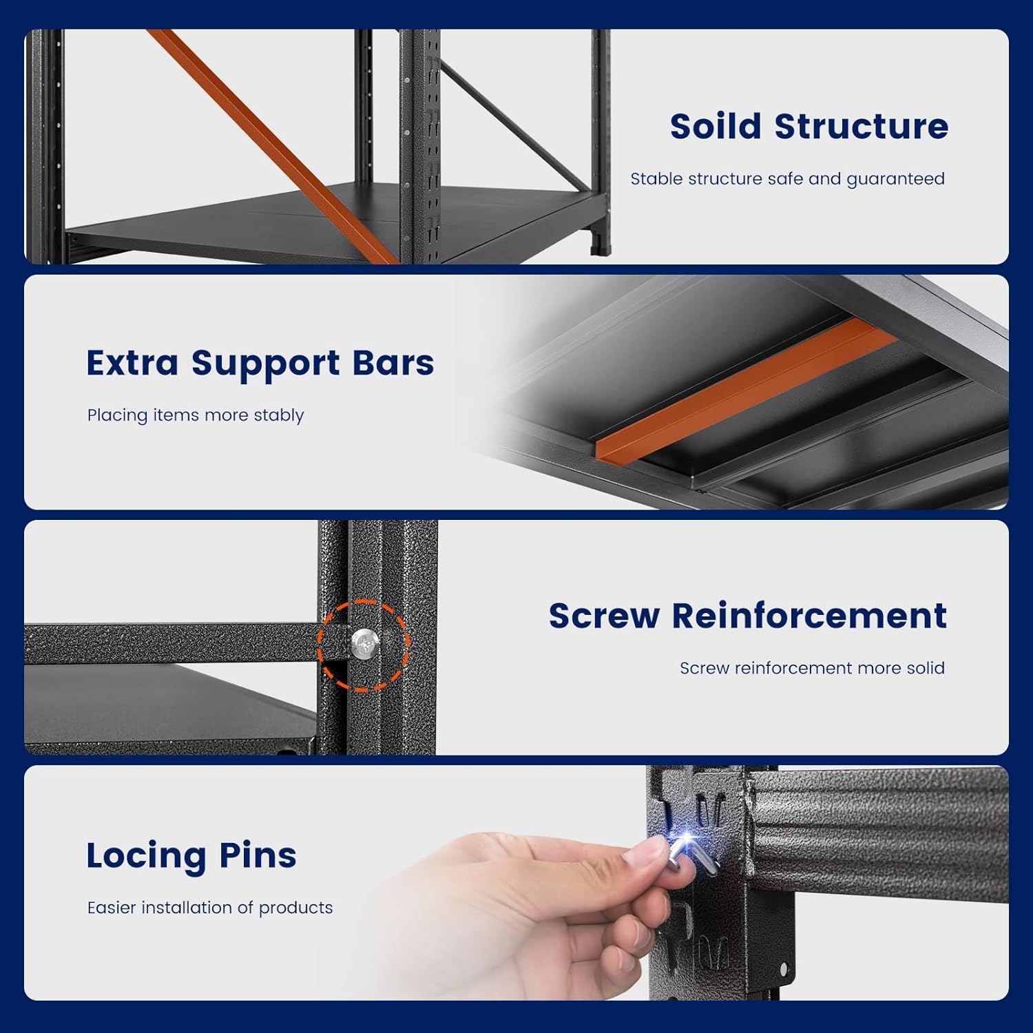 - ăSturdy DesignăThe garage shlelving units reinforced diagonal braces designs,its could evenly distribute the weight,features reinforcing ribs for added strength,ensuring strong stability and resistance to deformation.