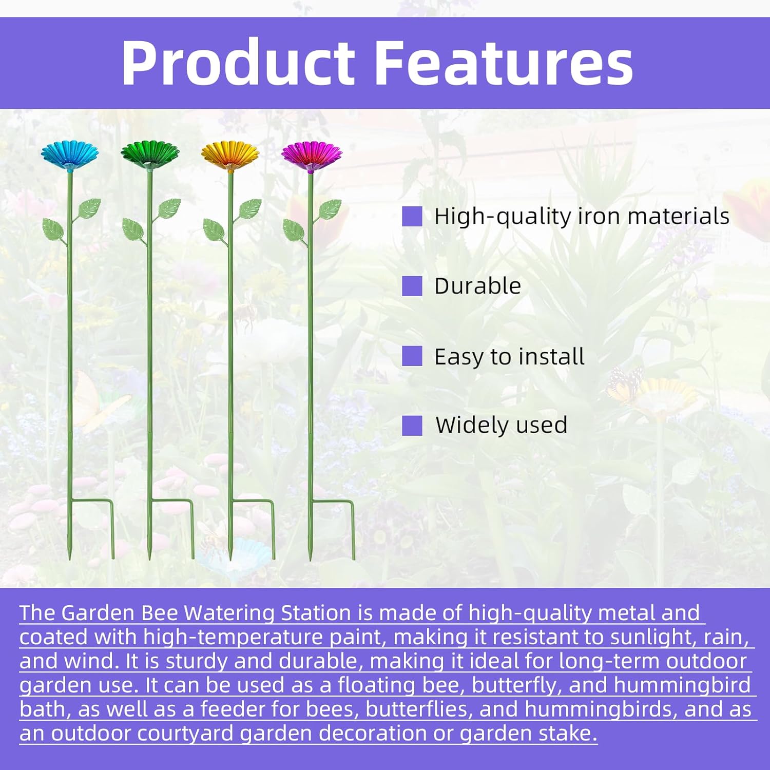 - Durability and weather resistance: This bee watering table is made of high-quality metal, coated with high-temperature paint, and can withstand sun, rain, wind, and sun exposure. The 3D flower design makes them fashionable and practical decorations in your yard, making them ideal outdoor metal flowers for year-round use and perfect for long-term use in outdoor gardens.