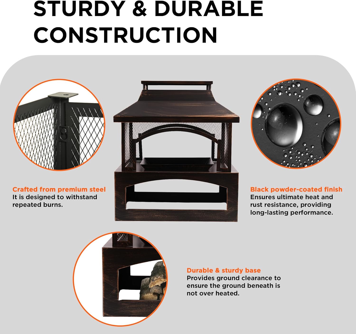 - Rain & Spark Protection: Our chiminea outdoor fireplace features a tower-style chimney with rain cover to shield flames, plus mesh screens to contain sparks. Enjoy safe wood burning in your fire pit without obstructing the beautiful fire view.