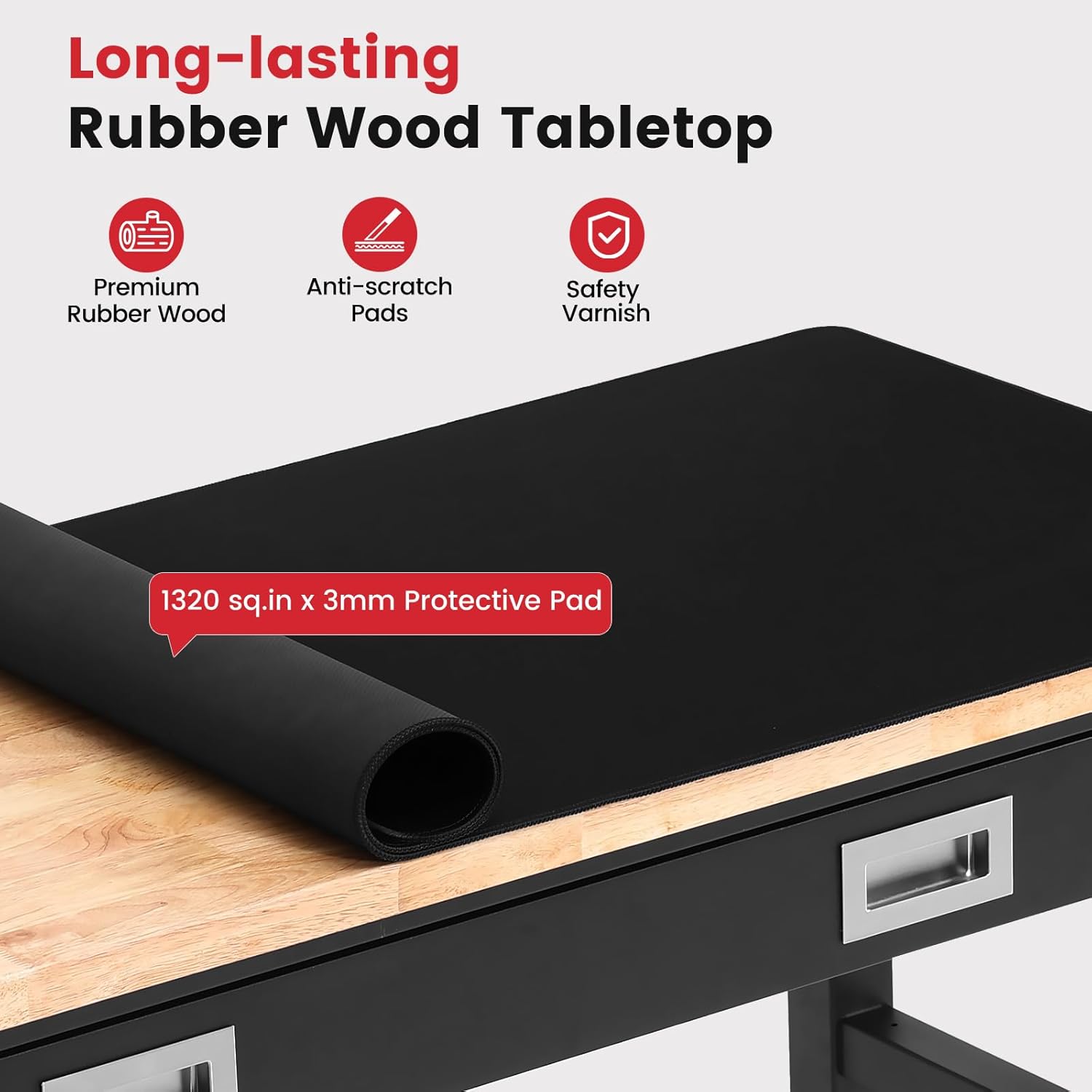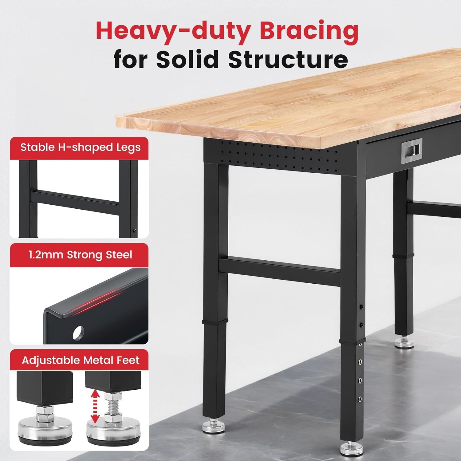 - Heavy Duty Rubberwood Tabletop: 1.2" solid rubberwood tabletop with protective varnish for lasting durability. Supports up to 2000 lbs, perfect for heavy-duty tools and materials.