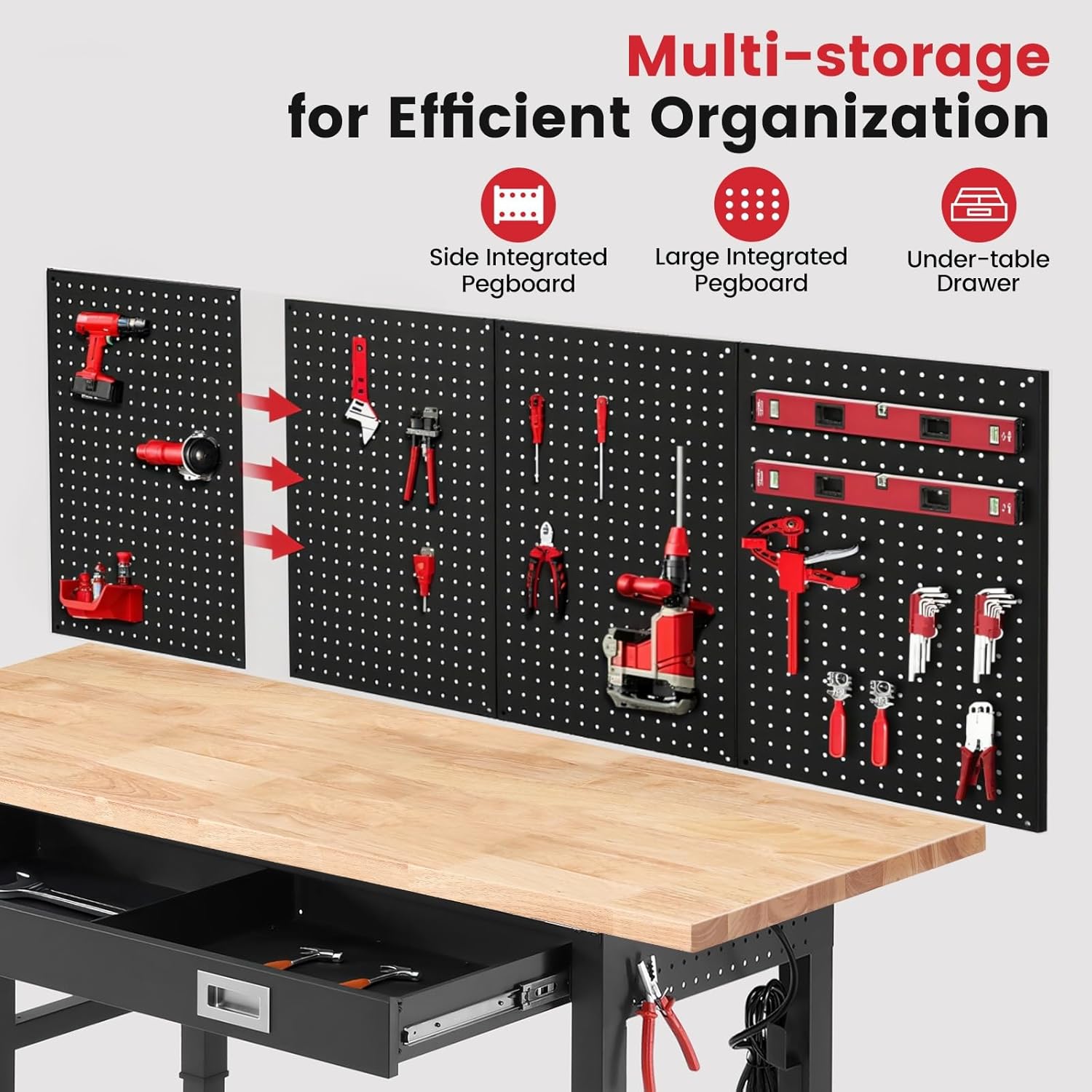 - Additional Storage & Functionality: ①4 combined pegboards and dual-sided pegboards for instant tool access and storage. ②Drawers provide easy storage and quick access to essentials. ③ ETL-certified power outlets and cord organizer keep power tools safe and cables neat.