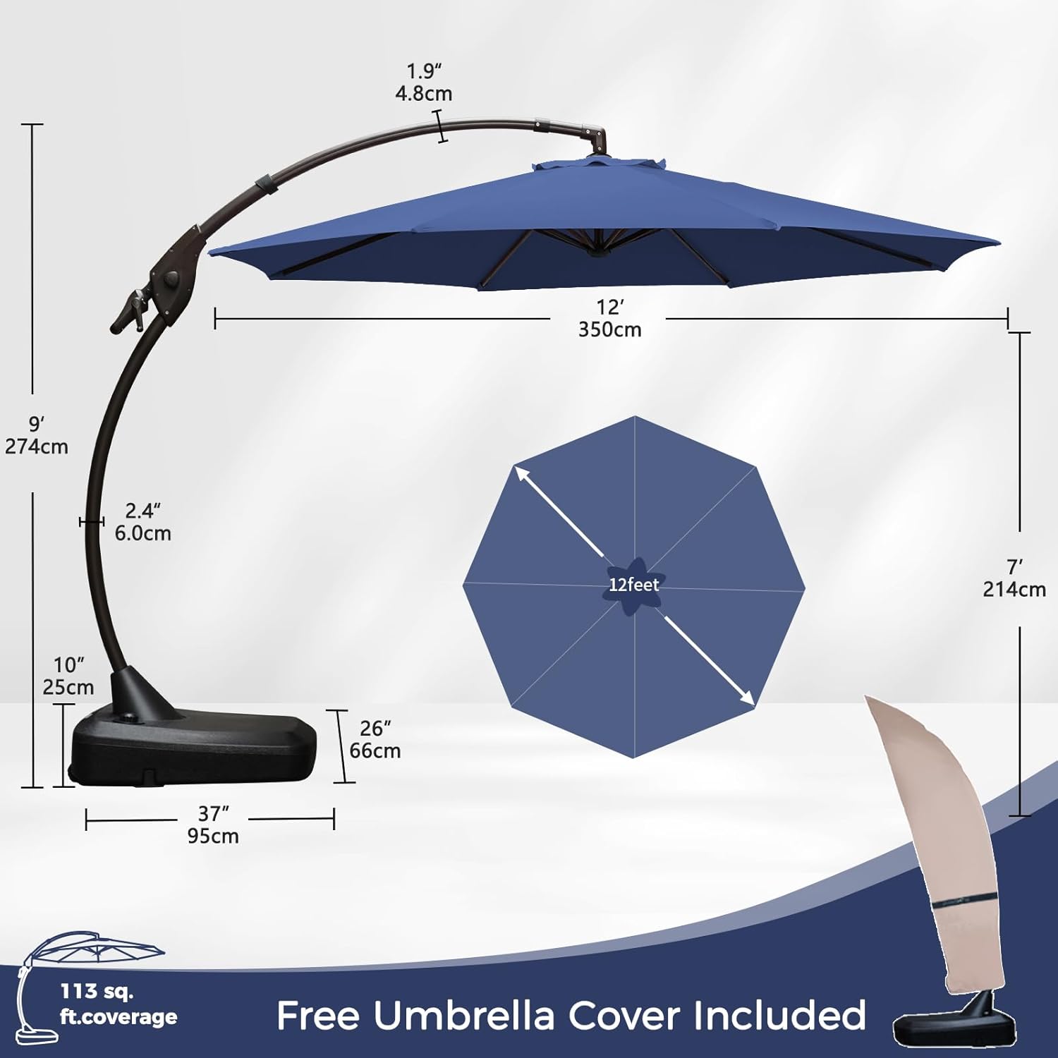 Grand patio 12FT Outdoor Offset Umbrella with Base & Cover Patio Aluminum Round Cantilever Umbrella for Garden Deck Poolside (Navy Blue, 12 FT)