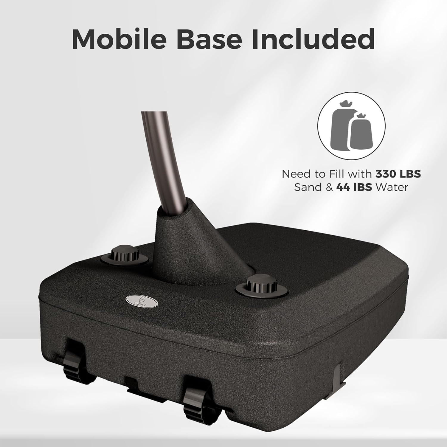 - WEIGHTED BASE INCLUDED: The base features integrated wheels for easy movement and steel reinforcement with hidden levelers for added stability. Fill with 330 lbs of sand and 44 lbs of water (374 lbs total) for enhanced stability in breezy conditions