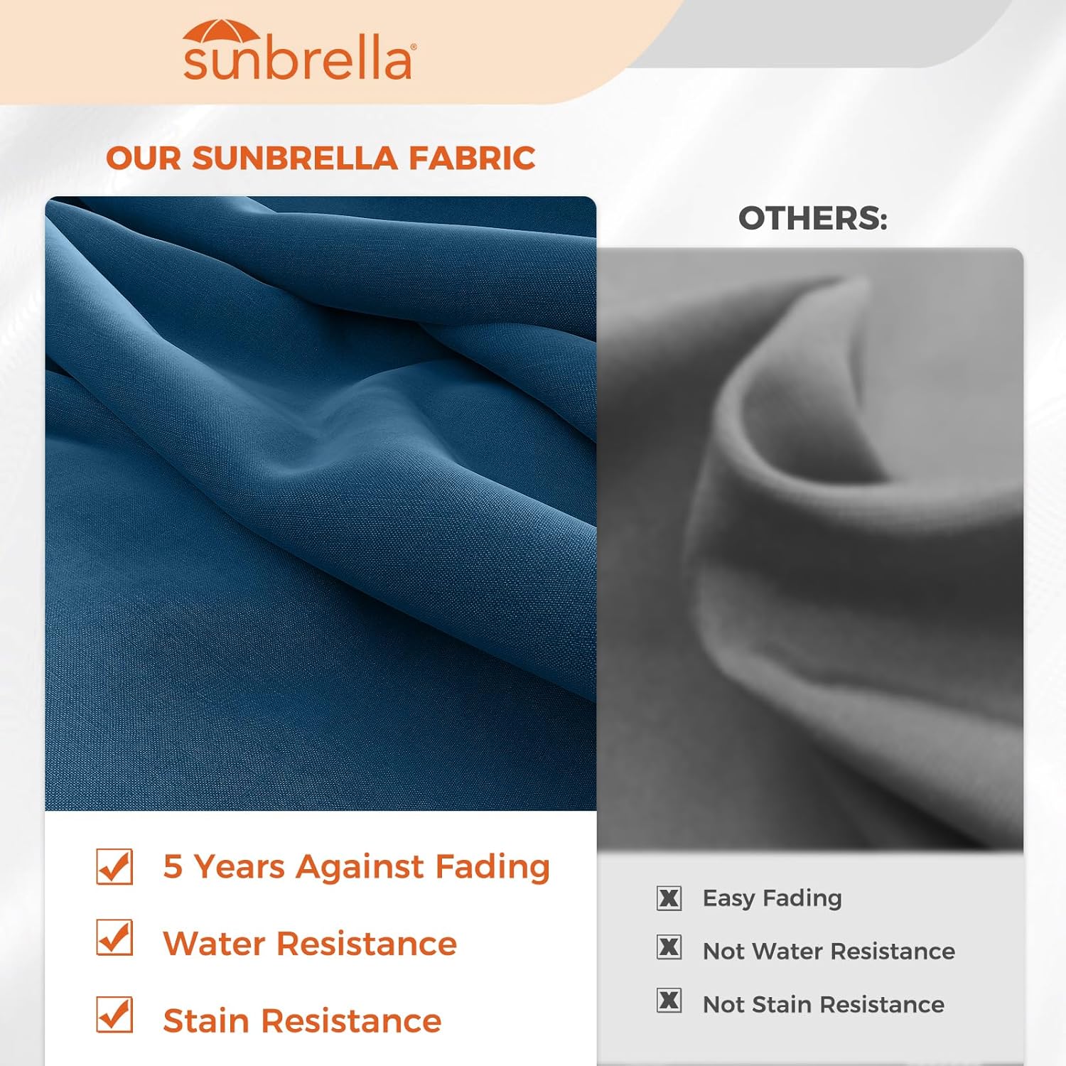 - SUNBRELLA FABRIC: Premium quality umbrella canopy made from industry-leading Sunbrella fabric, 270-gram breathable outdoor fabric, 100% solution-dyed acrylic, 5 years fade-resistance, water and stain resistance, added sun protection against skin damage