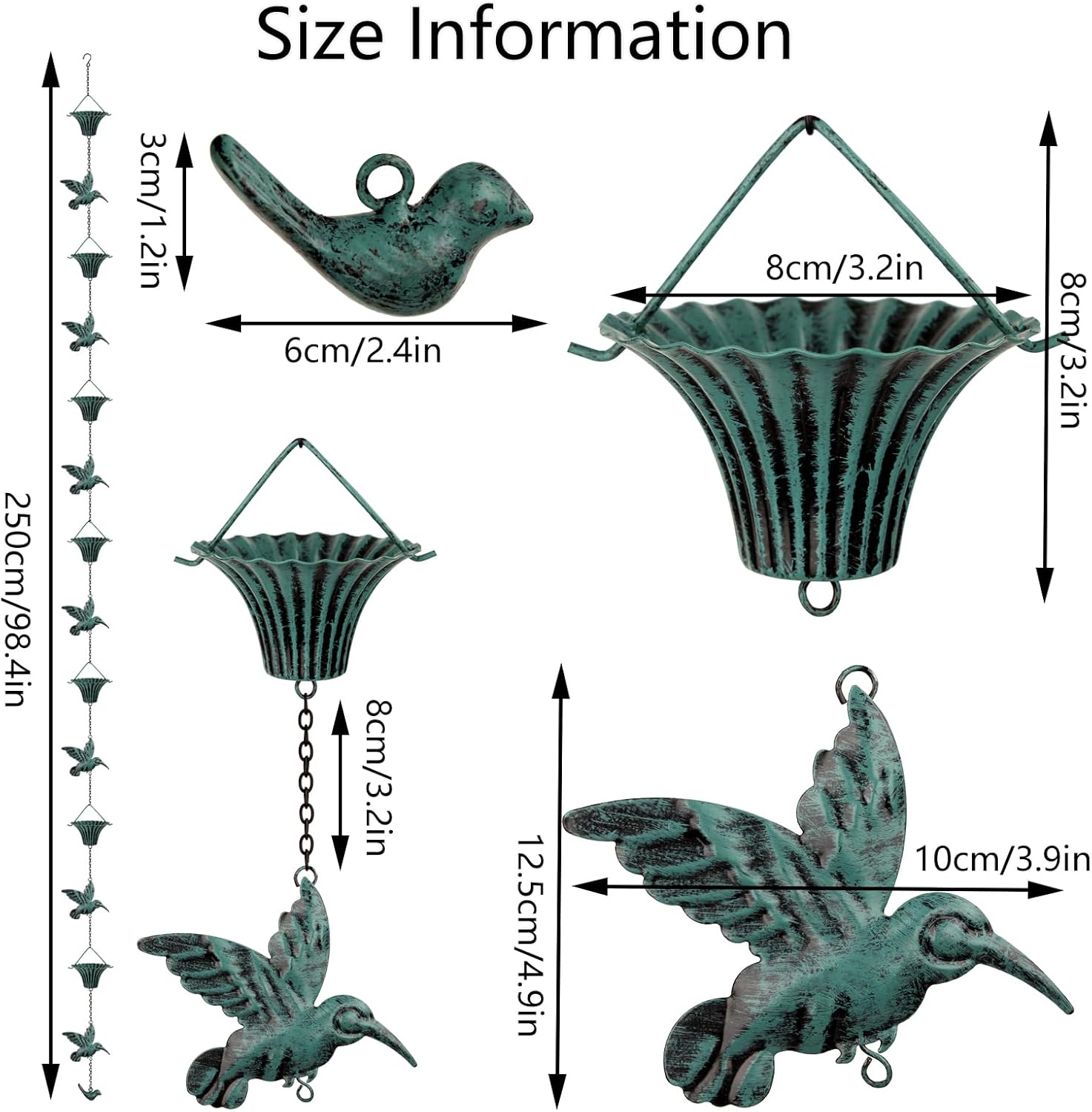 - UNIQUE DESIGN: This rain chains consists of Hummingbird and Cup Rain Chains, using a combination of airbrush process and Antique Copper powder design. Each one is carefully carved with rich details, giving you vivid visual enjoyment. Can add a unique artistic atmosphere to your garden, patio or outdoor space.