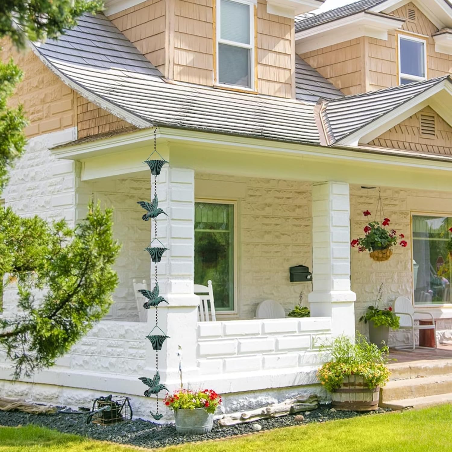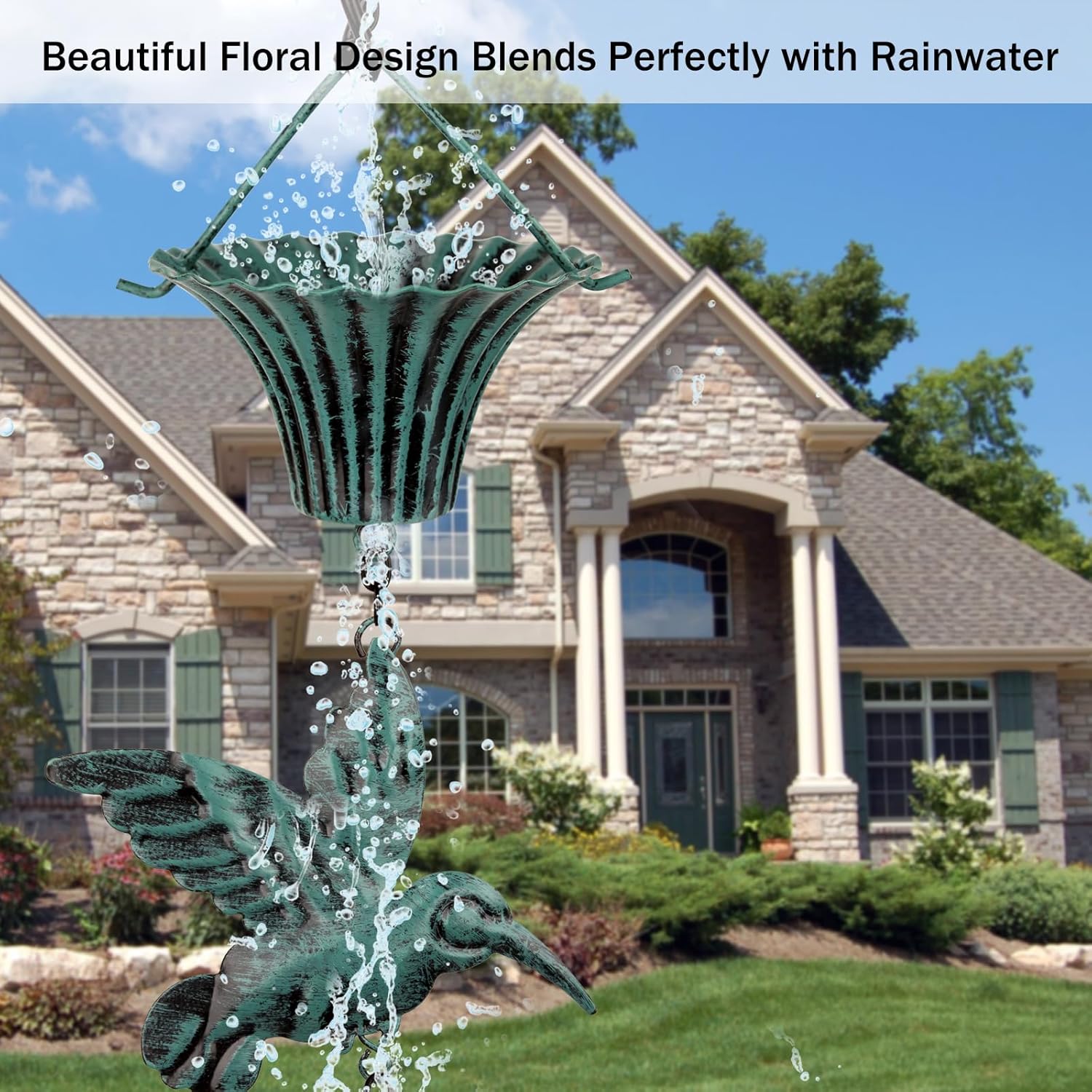 - CLEAR SOUND: The rain gutter downspout accessory includes composed of 7 flower-shaped cups and 7 hummingbirds,the bottom is decorated with a cast iron bird.when the breeze blows, the bell will make a clear and pleasant sound, adding a sense of tranquility and harmony to your outdoor space. This natural musicality makes you feel relaxed and like you are in the bosom of nature.