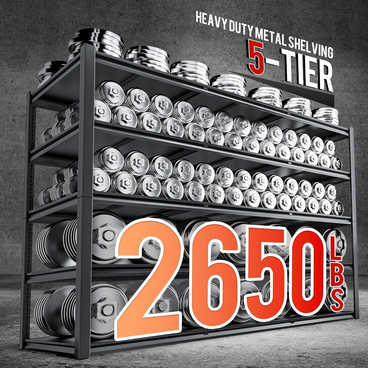 - ăHeavy Duty Shelving 2650 LBS Capacityă Supported by a reinforced frame with 5 sturdy support ribs, this unit has a huge total weight capacity of 2650 pounds (530 pounds per rack). Store heavy vehicle parts, aquaculture fish tanks, toolboxes, camping equipment, sports goods, paint cans, potted plants and books with confidence without worrying about bending or toppling over